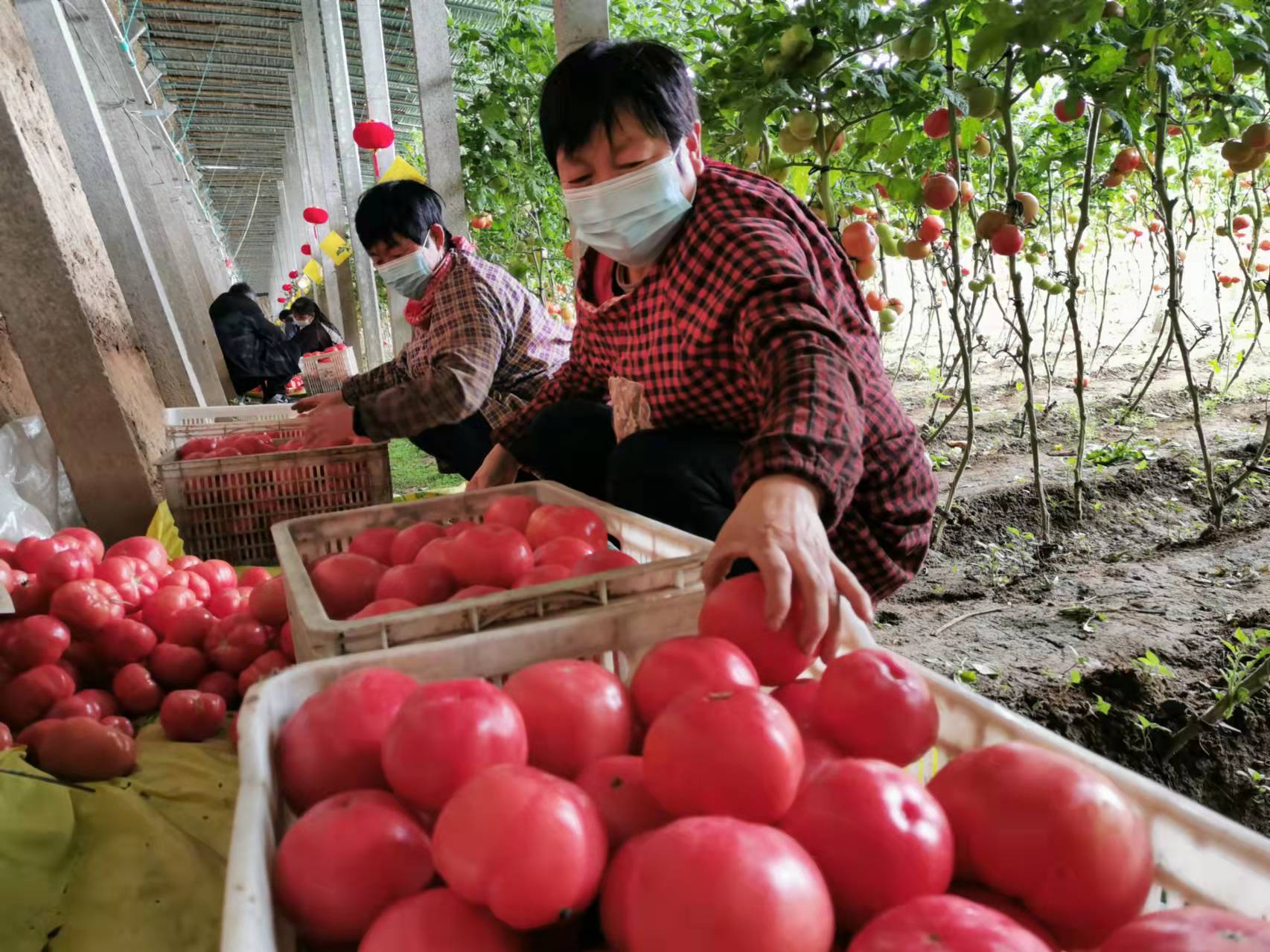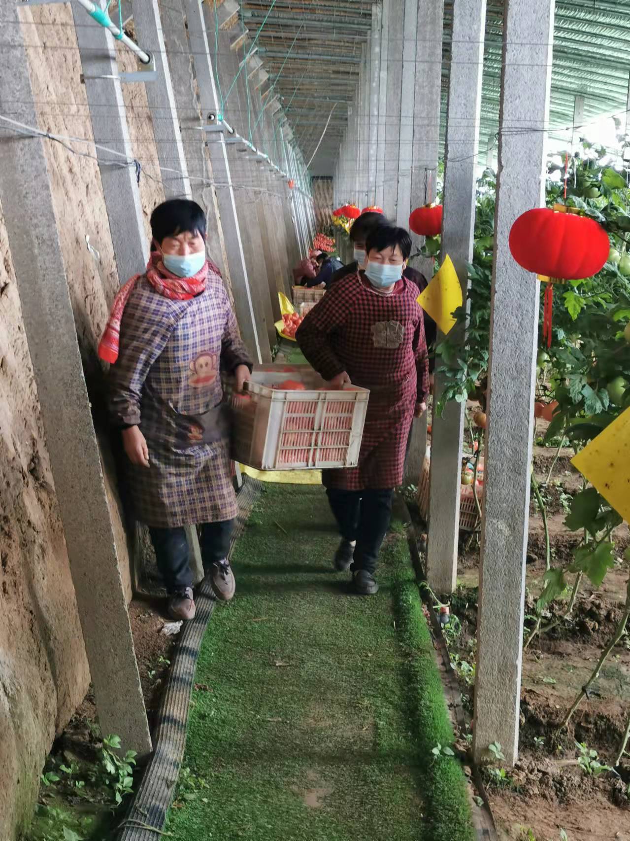 春節期間,位于該鎮的河北眾城農業發展有限公司日光溫室內,工作人員在整理搬運剛剛采摘的西紅柿。