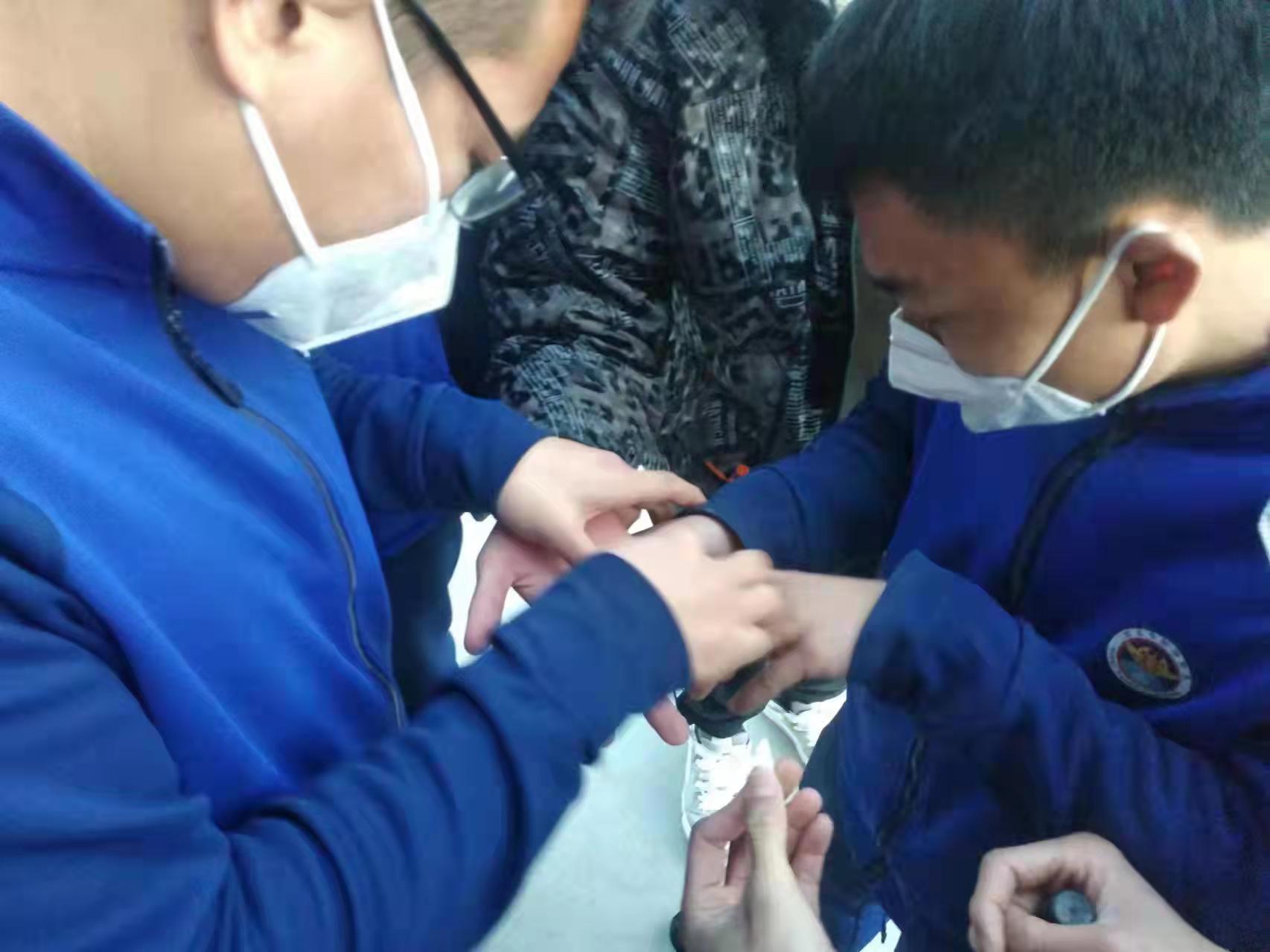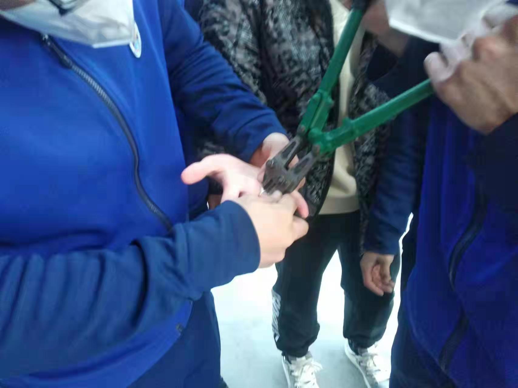 救援人員對學(xué)生手指被卡情況進行了仔細觀察,發(fā)現(xiàn)指環(huán)卡在男孩右手無名指上,由于指環(huán)卡得較緊,繞線圈和墊鑰匙的方法皆派不上用場。為避免造成第二次傷害,一名救援人員將紙插入手指與指環(huán)之間,支撐出空間,另一名救援人員用剪斷鉗在指環(huán)外側(cè)小心翼翼進行剪切,同時專門派人托住求助學(xué)生的右手,避免學(xué)生在害怕緊張情緒下,手指抖動造成第二次傷害。最后,在救援人員的共同努力下,指環(huán)被成功擰斷,學(xué)生手指成功脫出。