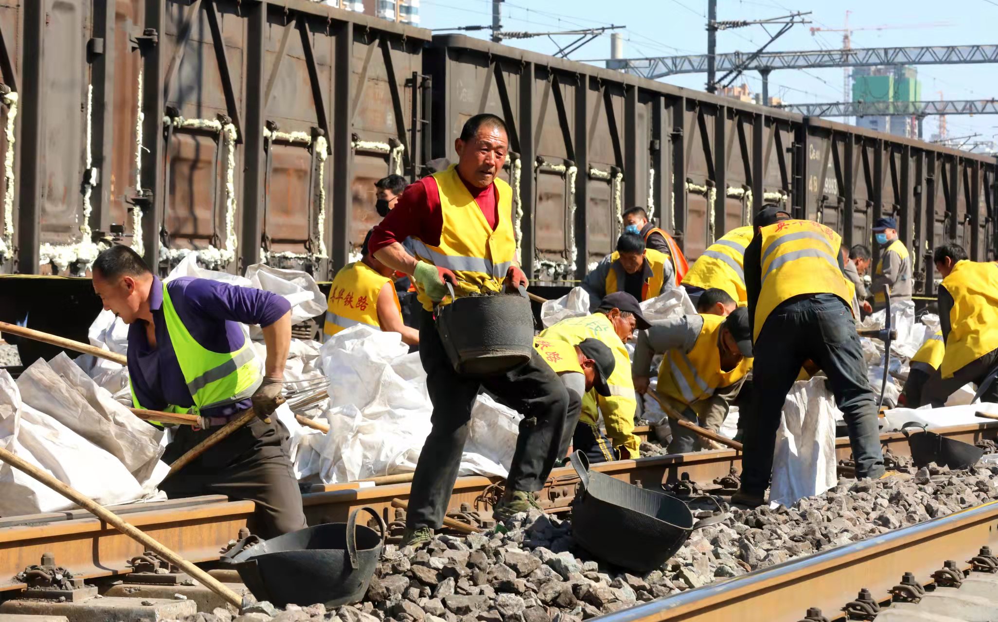 “現場設置好防護,開始作業!”隨著趙志虎一聲令下,職工們立即拿起鐵锨、揮起洋鎬、甩起鐵耙,大干起來。他們有的鏟,有的撓,有的耙,拼盡全力清理著道岔下的石碴,現場一派熱火朝天的景象。