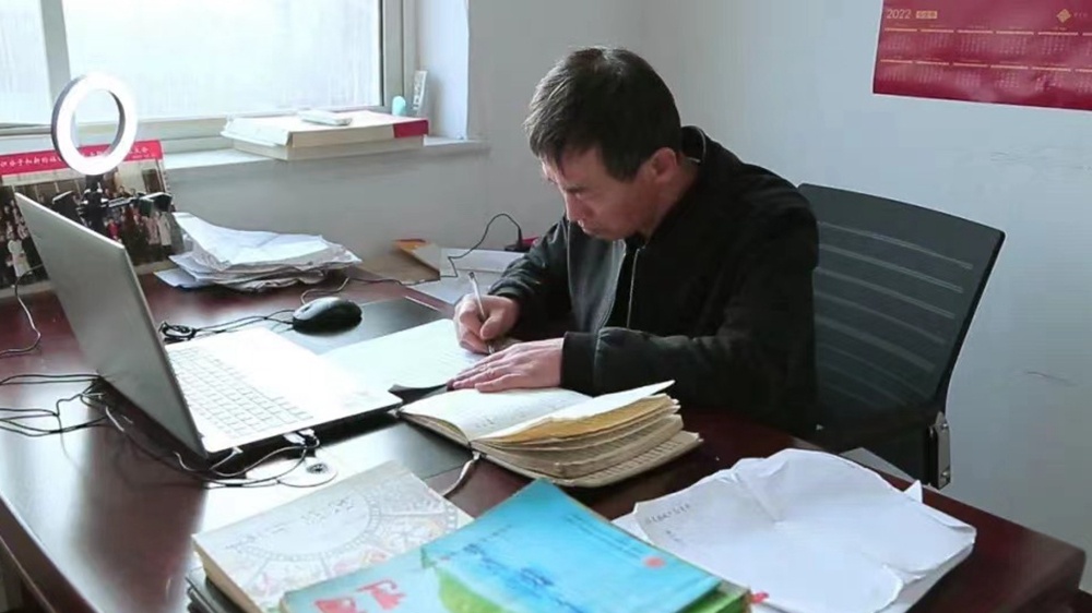 張小嶺在創作歌詞。武強縣融媒體中心供圖