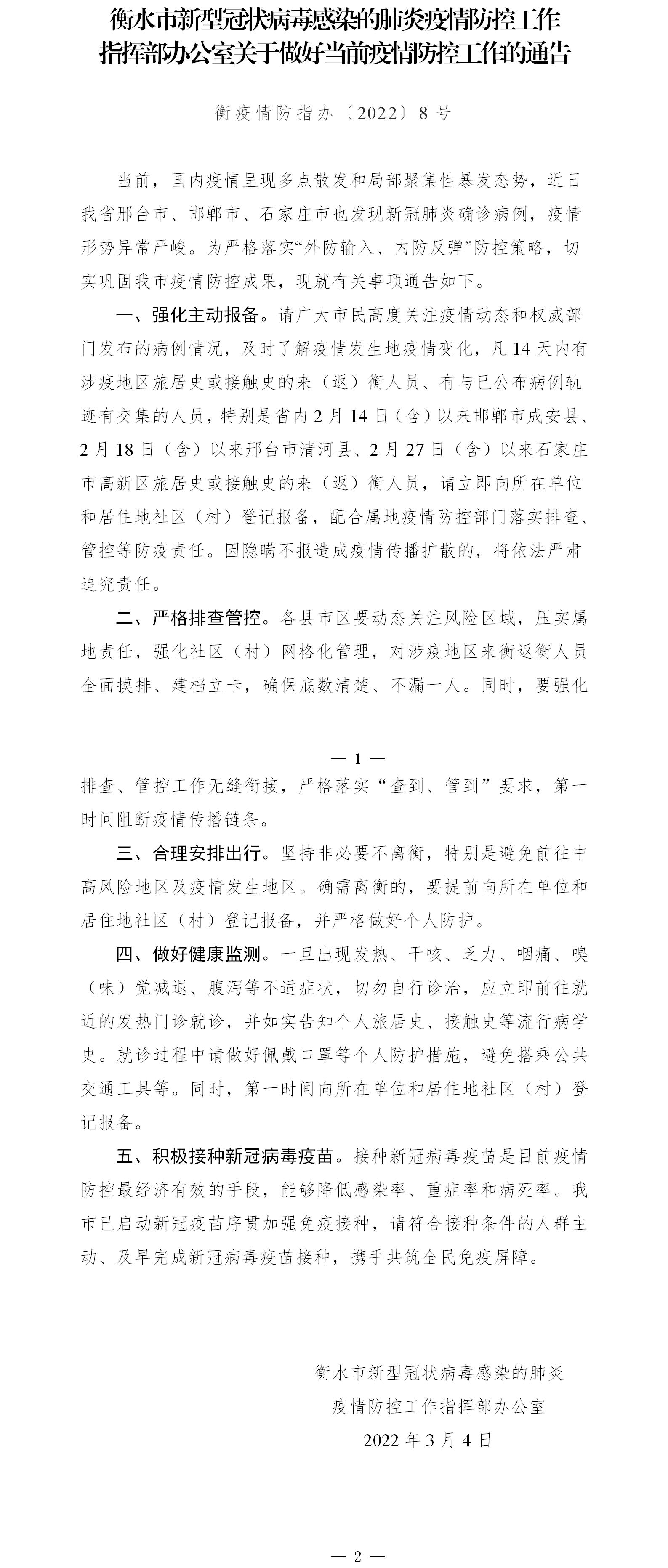 一、強化主動報備。請廣大市民高度關注疫情動態和權威部門發布的病例情況,及時了解疫情發生地疫情變化,凡14天內有涉疫地區旅居史或接觸史的來(返)衡人員、有與已公布病例軌跡有交集的人員,特別是省內2月14日(含)以來邯鄲市成安縣、2月18日(含)以來邢臺市清河縣、2月27日(含)以來石家莊市高新區旅居史或接觸史的來(返)衡人員,請立即向所在單位和居住地社區(村)登記報備,配合屬地疫情防控部門落實排查、管控等防疫責任。因隱瞞不報造成疫情傳播擴散的,將依法嚴肅追究責任。