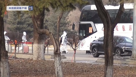 記者通過航拍看到,學生們在操場集合后帶著行李穿著防護服排隊分批次上車,等待轉運。