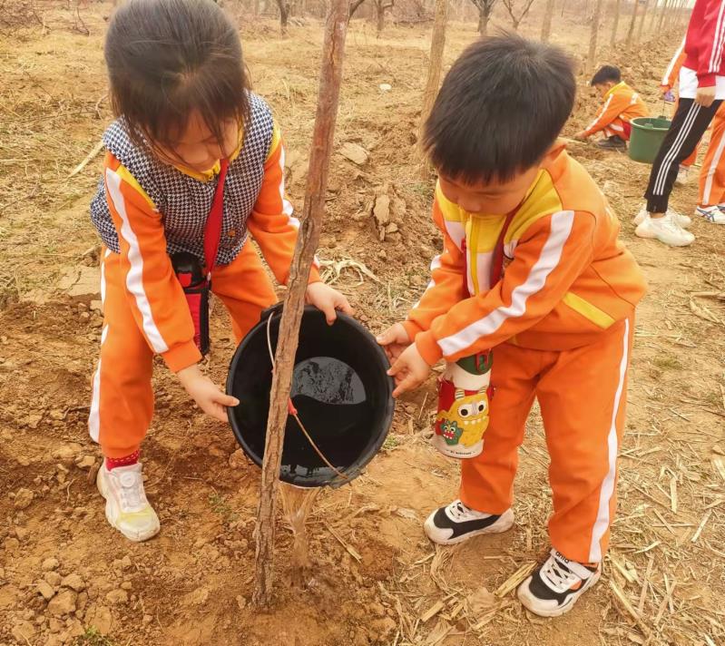 活動開始前,綺苑農莊的專業園林老師為大家普及了植樹的相關知識。隨后,大家紛紛拿起鐵鍬、鐵鏟等工具,把一株株樹苗植入樹坑,并細心地往坑內填土、培實,打水、提水、澆水,孩子們熱情高漲,個個忙得不亦樂乎。最后,孩子們在老師的帶領下,將寫有“我與小樹一起健康成長”和自己姓名的認養牌掛在自己種植的小樹上,開心地與小樹一起合影留念。6歲的劉紫碩看著自己新栽的小樹迎風挺立,高興地說:“這是今天我和同學一起種下的小樹,希望它快快長大。”