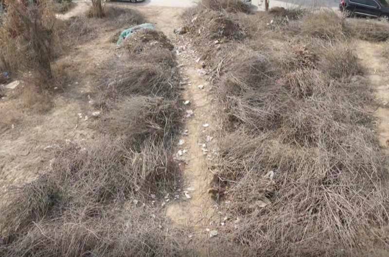 當日15時許,記者來到該交叉口,只見西北角分別有一個街邊公園和一座公共衛生間。在公共衛生間北側的空地上,堆積著不少枯草藤蔓,中間有條一米多寬的小路。順著小路向東走去,兩側堆積著許多從樹木上修剪下來的枯枝,形成長約十余米的枯枝帶,其內夾雜著塑料袋等垃圾,雜亂不堪。