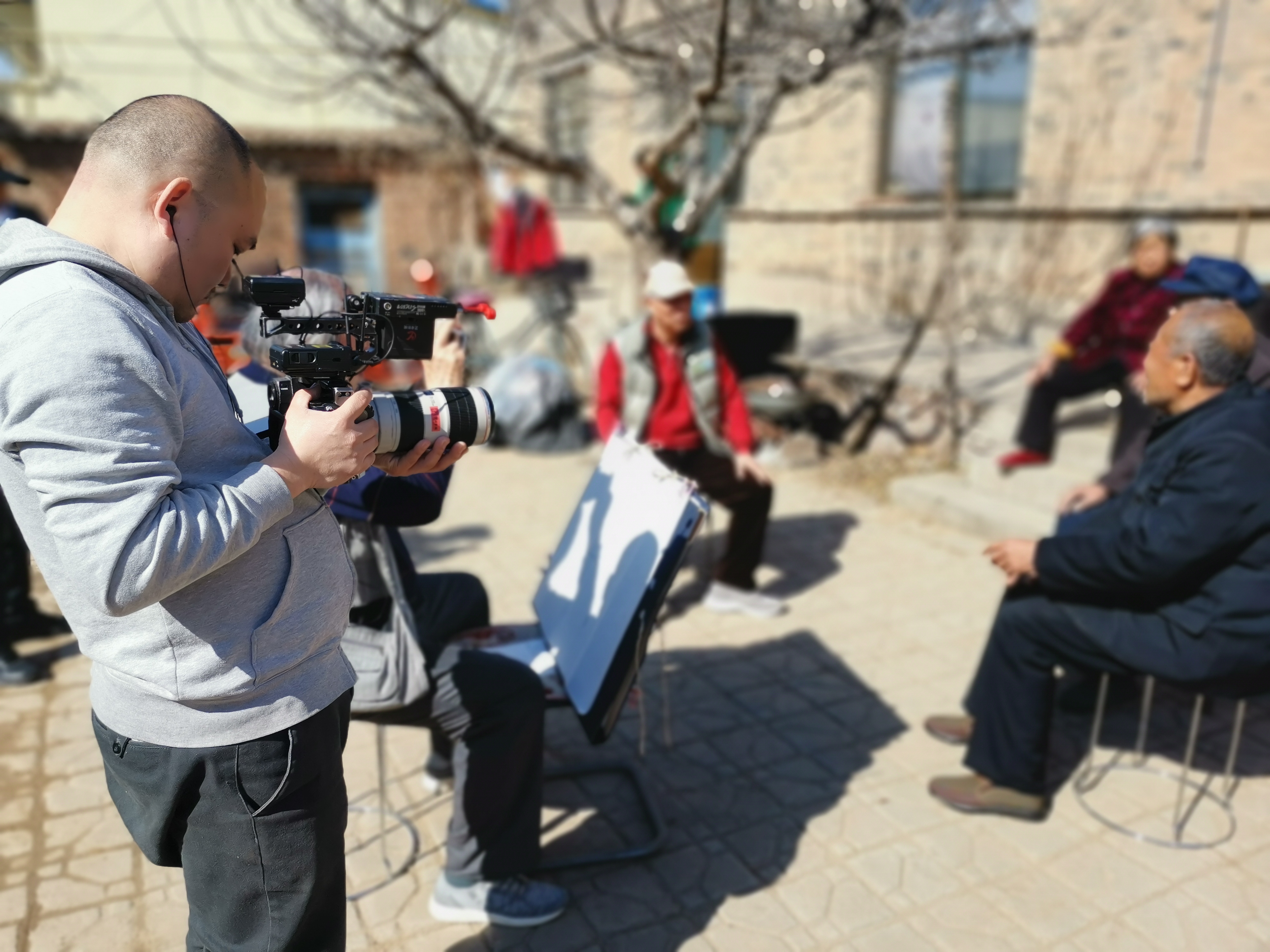 攝制組在安平縣大同新村(原槐林莊)采訪冀中騎兵團三打槐林莊的親歷者岳彥卿、知情人王萬增。