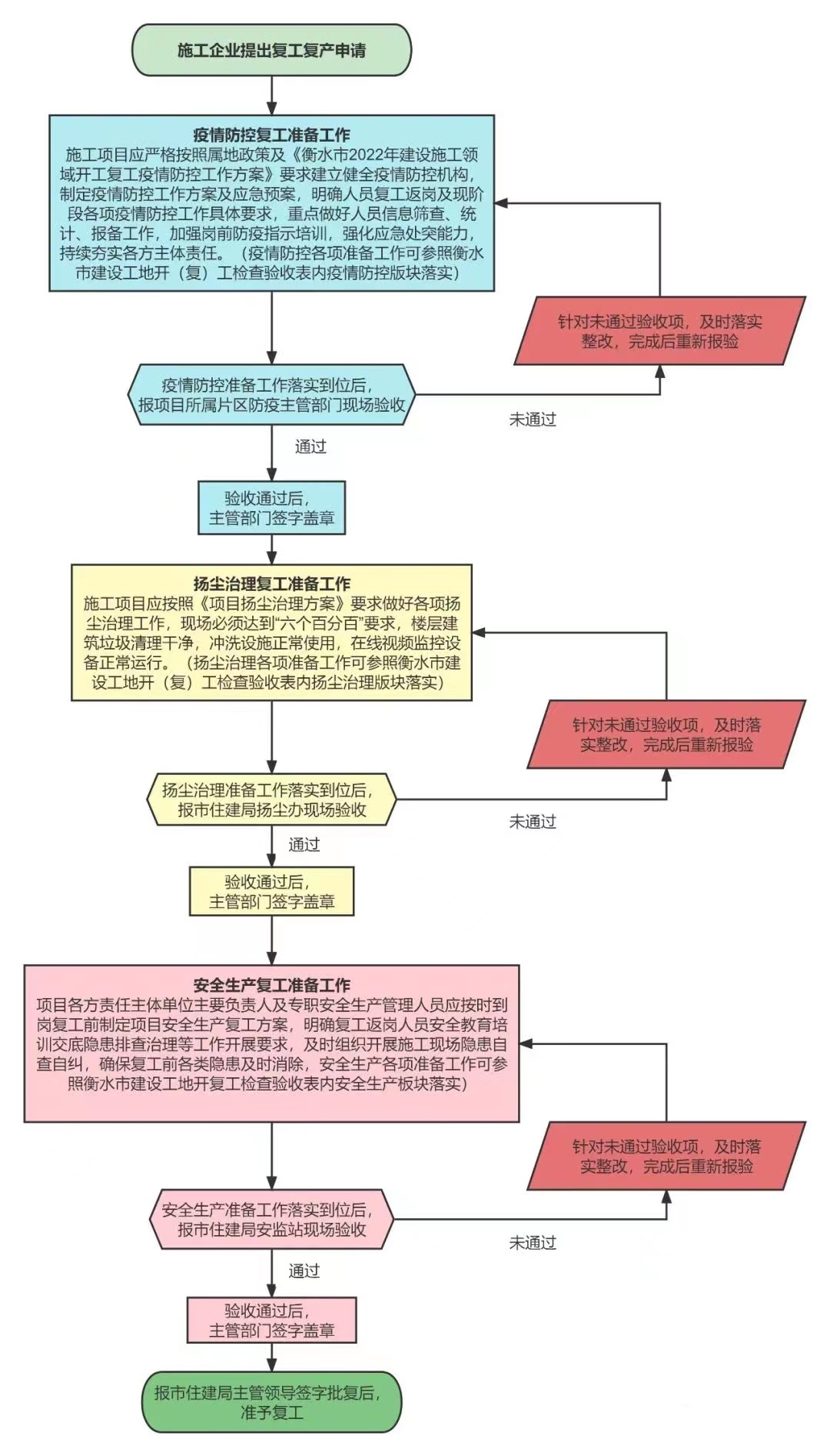 制定《衡水市2022年建設施工領域開復工流程圖》。實行“掛圖作戰”,科學指導和規范建設施工領域疫情防控工作,確保每一個申請復工的工地都遵循復工流程、都有標準的疫情防控方案、都能落實最嚴格的揚塵治理和安全生產責任和措施。