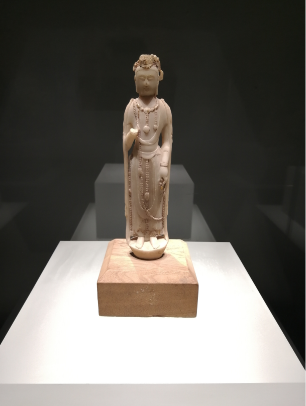 1984年景縣開福寺遺址岀土。該立像為白玉石質,觀音頭戴寶冠(部分缺失),身披瓔珞,瓔珞自肩部下垂至底座。袒胸,右手(已殘)置于胸前,左手提香袋,跣足立于圓形仰蓮底座之上。面部表情慈善安祥,整體造型勻稱流暢。通體鎏金(大部分已脫落)。其制作工藝繁縟精細,為北朝佛像的上乘之作。該造像高25厘米,館藏二級文物。