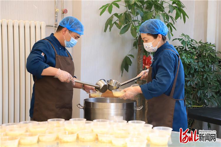 圖為固安縣供餐單位工作人員在分裝打包雞蛋湯。