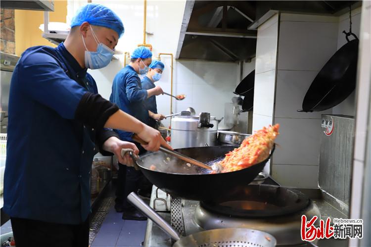 圖為固安縣供餐單位廚師在后廚準備餐食。