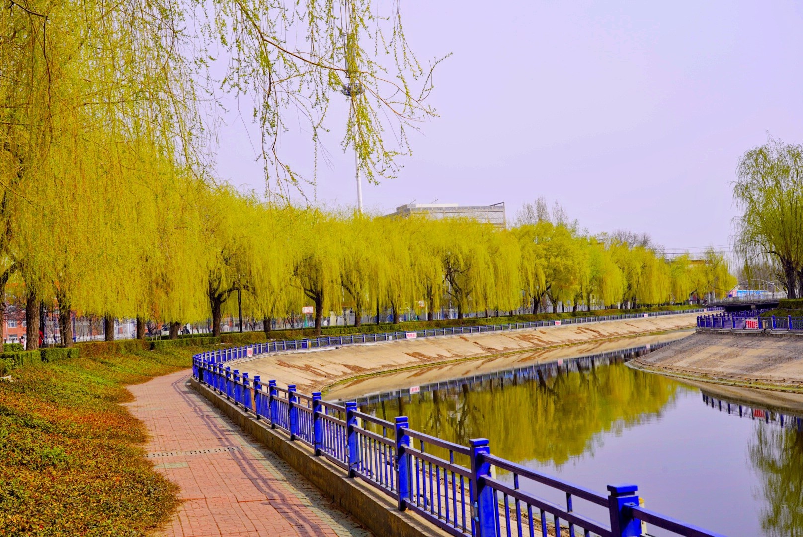 路人在垂柳吐綠的河邊散步。白懷勝 攝