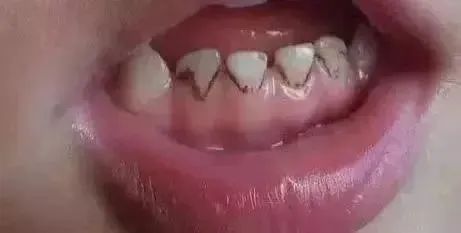黑色素如下圖,摸起來(lái)牙齒表面光滑,黑黑的,用手指摳或者刷牙的時(shí)候能弄掉一點(diǎn)點(diǎn),但是始終無(wú)法完全清除,這就是黑色素。