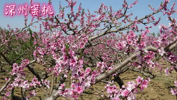 深州蜜桃馳名中外,有2000多年的栽培歷史。蜜桃花朵大,花瓣肥厚,舒展,紅粉中有嫩葉的點綴,高雅素麗,雍容淡雅。一年一度的深州桃花觀賞時節又將來臨,深州以盛產蜜桃而揚名,到處都是桃園。深州穆村鄉西馬莊的蜜桃觀光園是有名的觀花地,上萬畝桃花競相綻放,如虹似霞,成方連片,美不勝收。