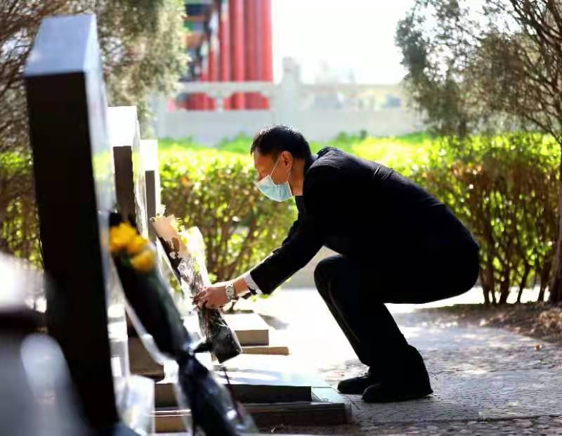 沿著筆直的小路,穿過成蔭的樹林,映入眼簾的是莊嚴肅穆的烈士墓區,每一個被擦得錚亮的墓碑前都放著一束黃菊。長眠于此的57名烈士,有38位有名烈士,19位無名烈士。彭輝告訴記者,近幾年受疫情影響,陵園先后閉園、限流、不接待團體祭掃,一些外地的烈士親屬無法到陵園祭奠親人。為此,陵園主動聯系每一位烈士親屬,為無法到陵園祭掃的烈士親屬提供以擦拭一遍墓碑、敬獻一束鮮花、打一個慰問電話為內容的代祭掃服務,在大力弘揚英烈精神的同時為烈士親屬帶去溫馨和慰藉。