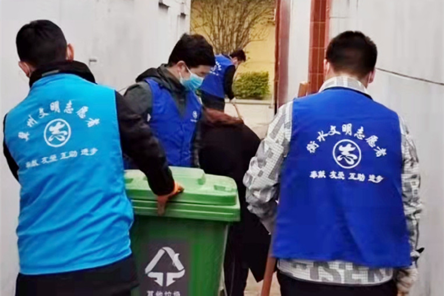 冀州區(qū)行政審批局志愿者深入小區(qū)整理垃圾箱。冀州區(qū)行政審批局供圖