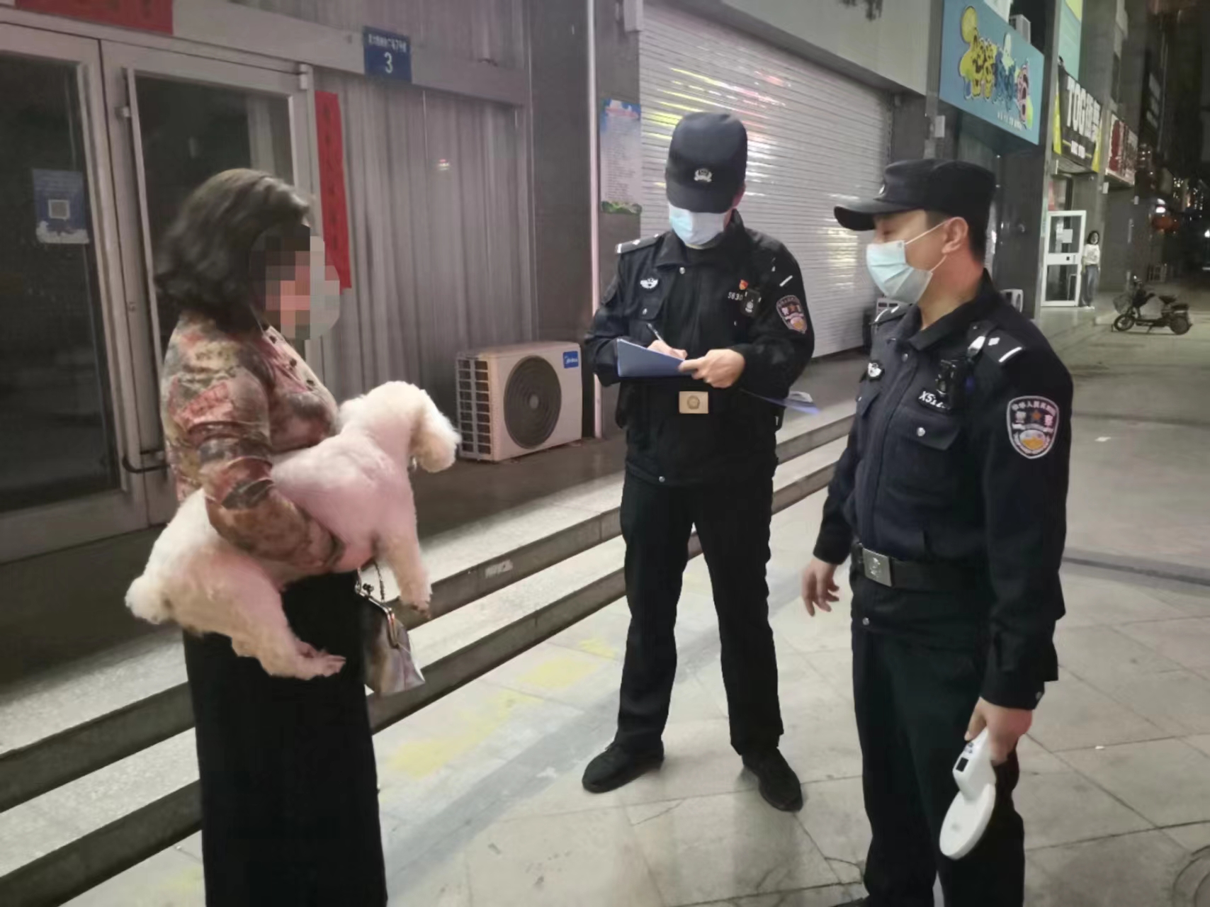 4月9日晚,在康寧街便道上,一只未拴繩的小狗正在亂跑,它的主人則慢悠悠地跟在后頭。直到看到民警走過來,狗主人才跑上前來抱起狗,為它拴上繩子。民警告知犬主,根據《條例》第二十一條第二款規定,養犬人攜帶犬只外出的,應當由完全民事行為能力人為犬只束1.5米以內的牽引帶帶領,或者懷抱、裝入犬袋犬籠。隨后,民警根據《條例》相關規定,對犬主進行警告并處以罰款。