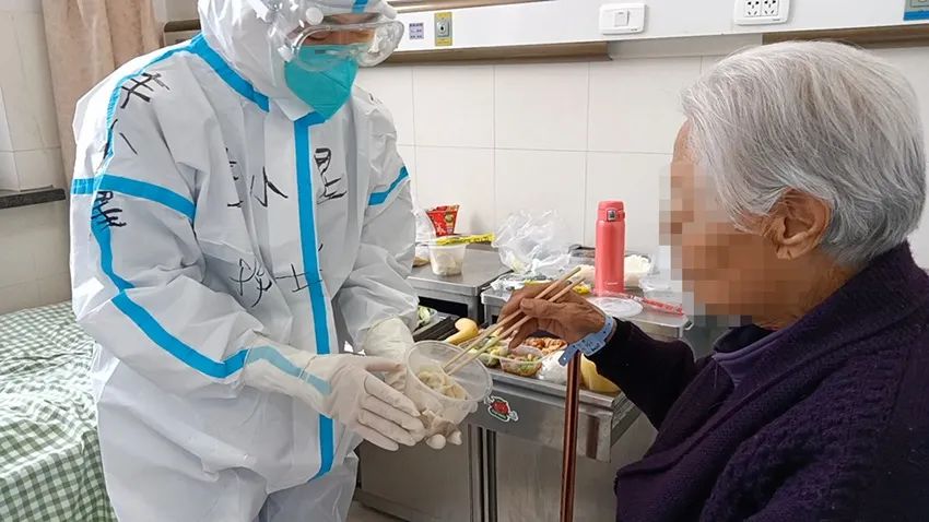 進入專區后,醫療隊對李奶奶進行了全面體檢,并對其狀況進行綜合評估,制定個體化治療方案。除了常規醫療救治、生活護理以外,醫護人員還對李奶奶進行了心理舒緩輔導,根據其營養狀態調整食譜。醫療隊通過醫患家屬溝通微信群,及時與李奶奶家屬電話溝通病情,并將其詳細入院狀況評估報告一對一傳送給家屬。