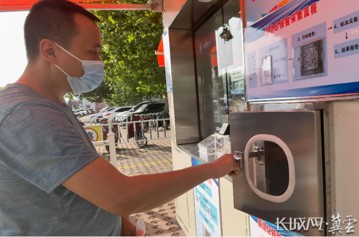 采集完核酸之后,居民將采樣管放入潔凈傳遞窗。 長城網·冀云客戶端記者 李慧英 攝