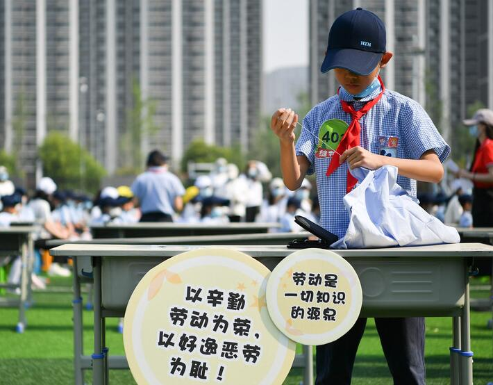 2021年11月10日,陜西平利縣城關第三小學3年級1班的學生在學校內(nèi)務整理室內(nèi)學習疊衣服。 新華社記者 邵瑞 攝