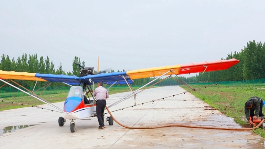工作人員向滑翔機(jī)注入藥液。武文學(xué) 攝