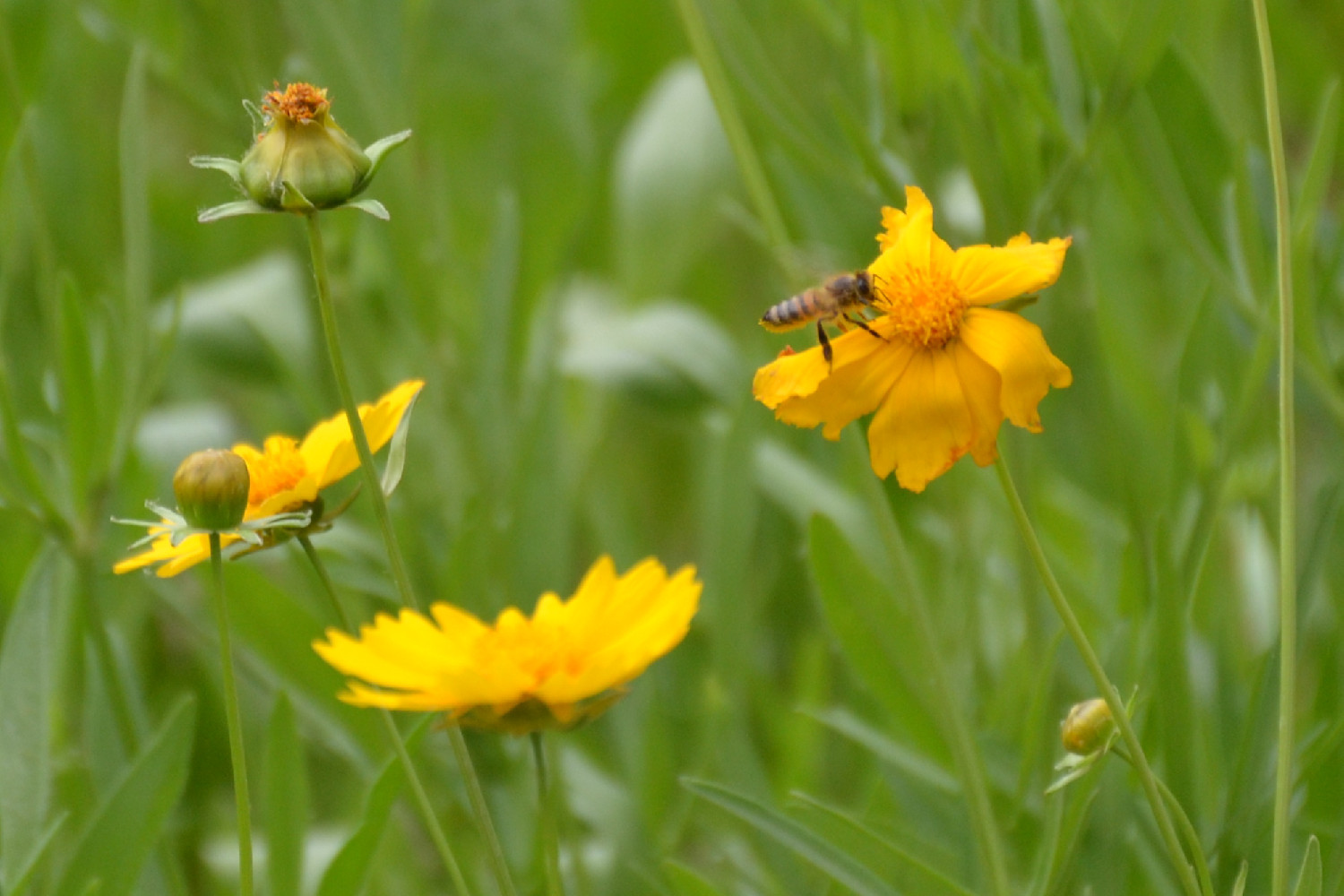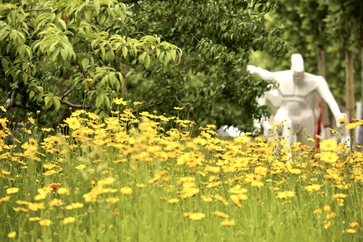 美麗的花朵和雕塑在路邊交相輝映。賈瑞潔 攝