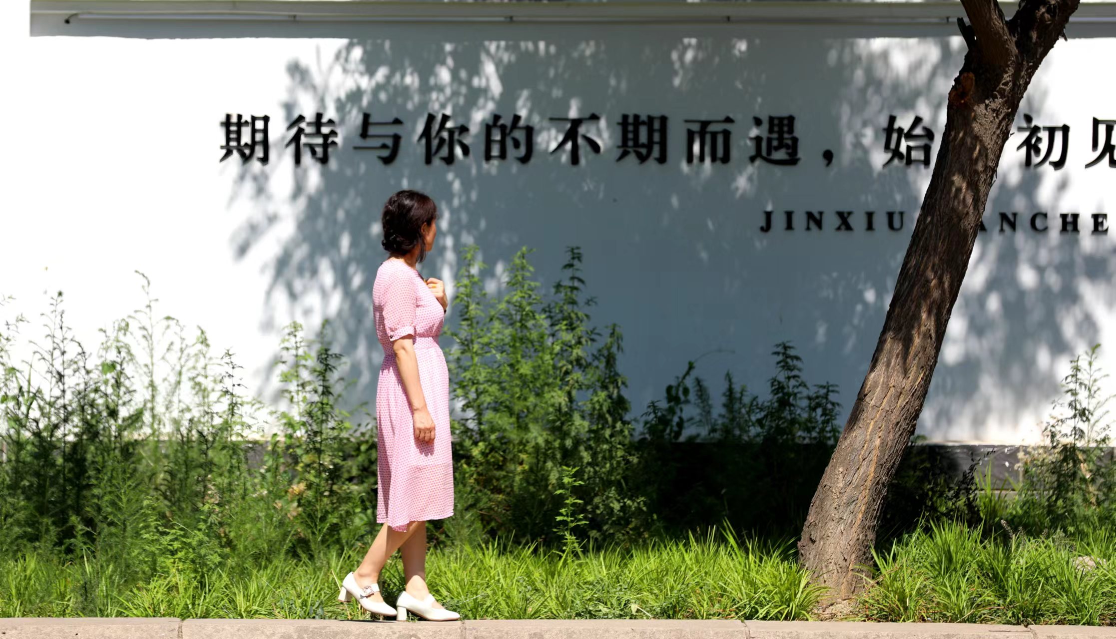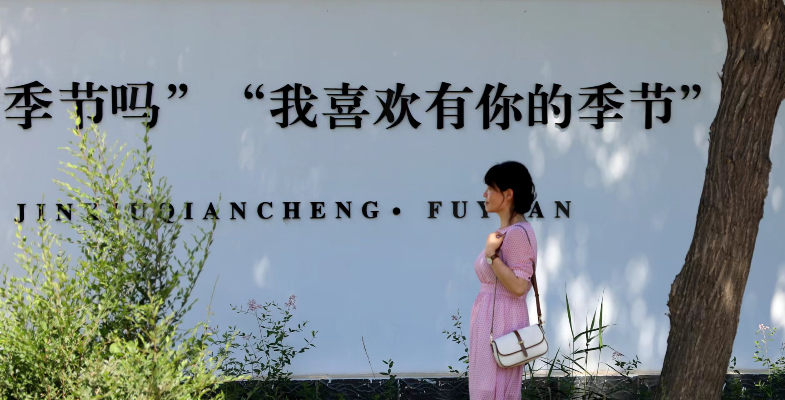 白墻黑字在綠草和樹影斑駁的點綴下,“變身”為生動形象又不失浪漫的風景,獨特風格洋溢著煥然一新的活力,勾起不少行人的情懷,他們或駐足,或拍照留念。