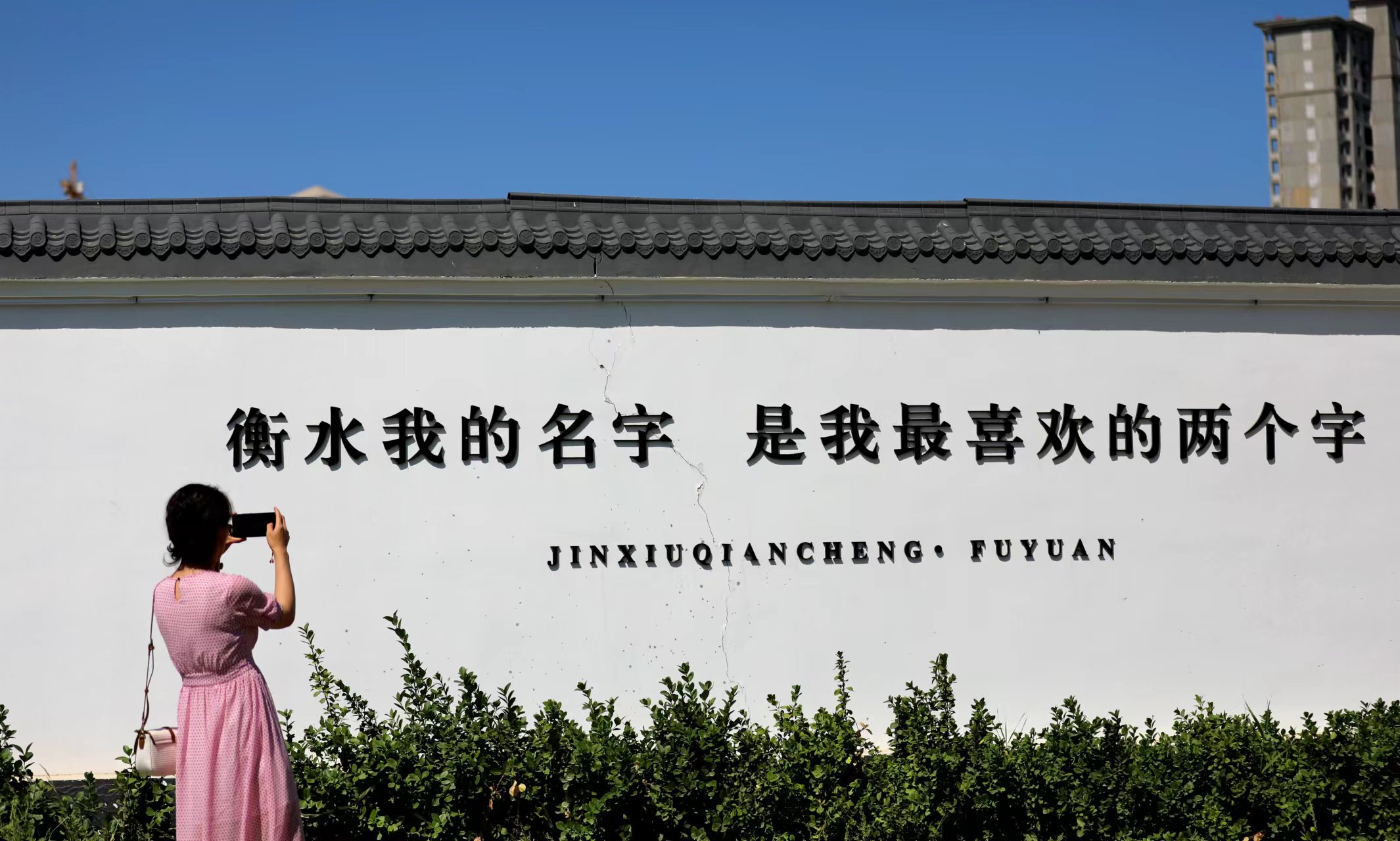 27日,記者慕名來到這處網紅打卡地。“我們是如此熱愛衡水”“衡水我的名字,是我最喜歡的兩個字”“這個世界有點苦,我想給你一點兒甜”……眼前,一面上百米的白色建筑工地外墻上,赫然用黑色文字書寫著這樣的一句句話語,字里行間流露出浪漫和情懷,像是對這座城市抒發著自己的熱愛,又像是正在對心上人吐露心扉。