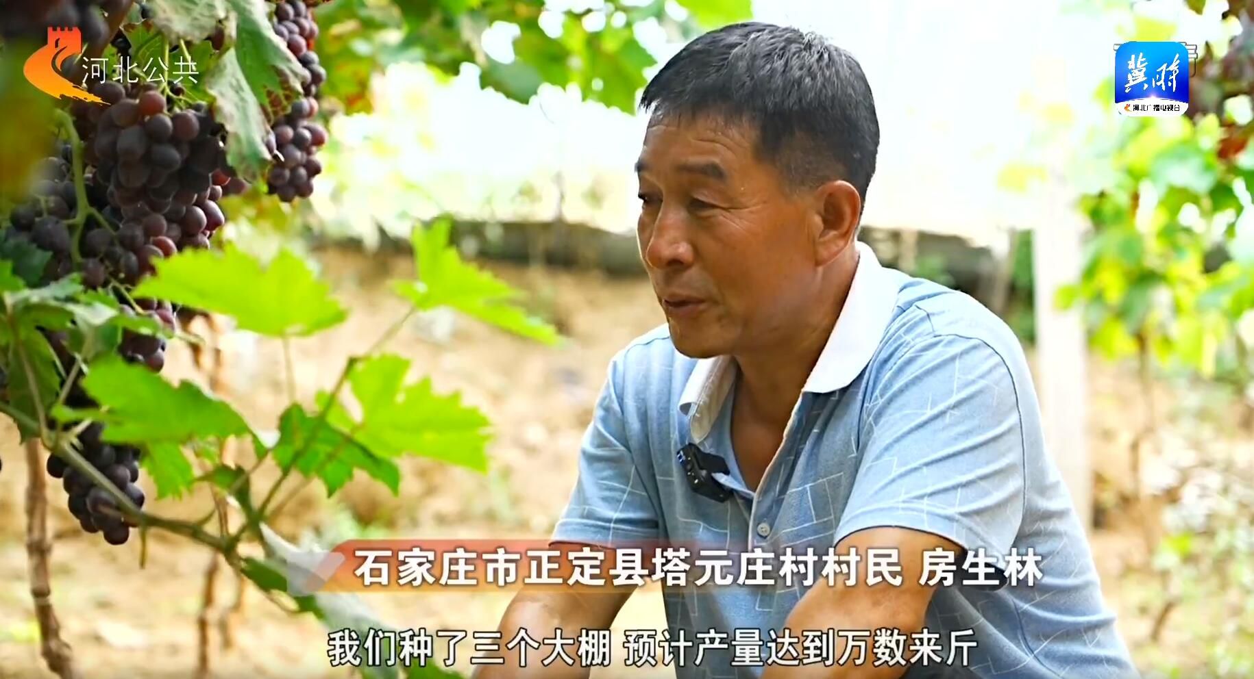 看,我們這串葡萄長得多好,我們種了三個大棚,預計產量達到萬數來斤。