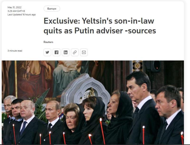 據路透社30日援引消息人士報道,俄羅斯前領導人葉利欽的女婿瓦連京·尤馬舍夫宣布辭去總統顧問一職,但辭職原因暫不明確。