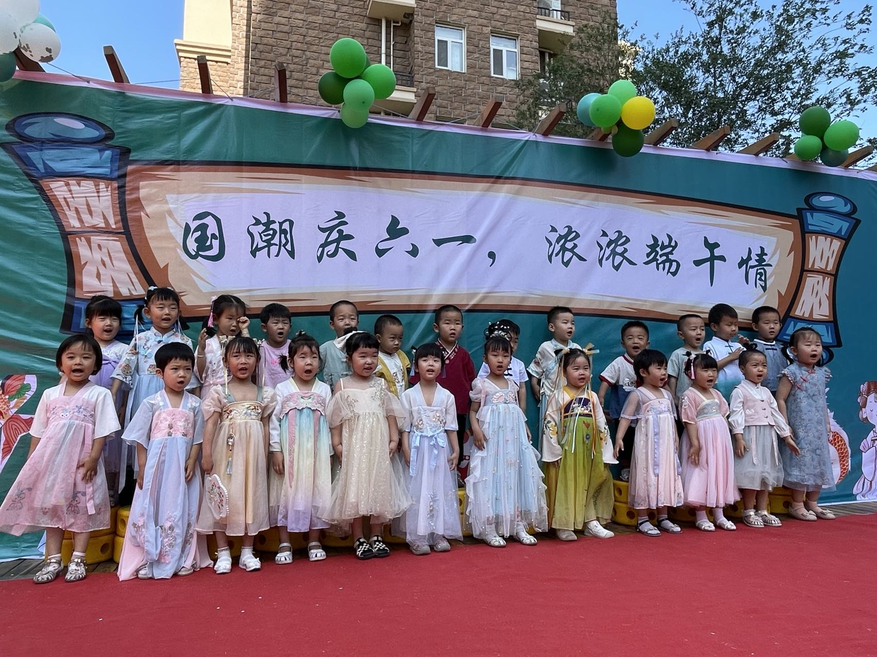 翠袖紅裙、青絲白褂……當天一大早,小朋友們就在家長的精心打扮下,喜氣盈盈地來到幼兒園,而在幼兒園門口,同樣身著漢服的老師們早已等候著他們的到來。鞠躬、行禮,“老師好!”在一聲聲問候中,孩子們開心地步入園內,天璽寶貝幼兒園的“國潮慶六一·濃濃端午情”活動也正式拉開帷幕。