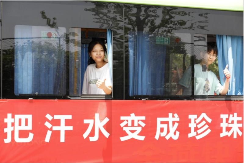 6月7日,在河南省平頂山市寶豐縣第一高級中學考點,考生結束首場科目考試后乘車離開考場。新華社發(何五昌 攝)