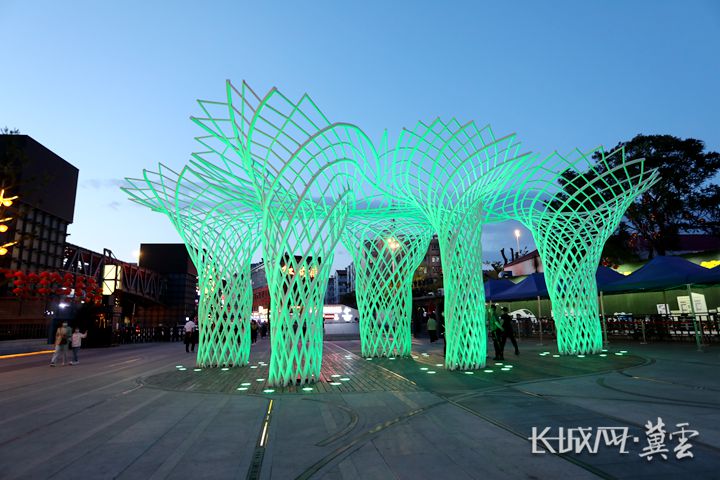 日漸黃昏,華燈初上,公園里奧運五色樹、蒸汽機車、“小蠻腰”燈光塔、詹天佑銅像等景觀區流光溢彩,熠熠生輝,大人、孩子爭相合影留念。