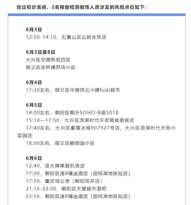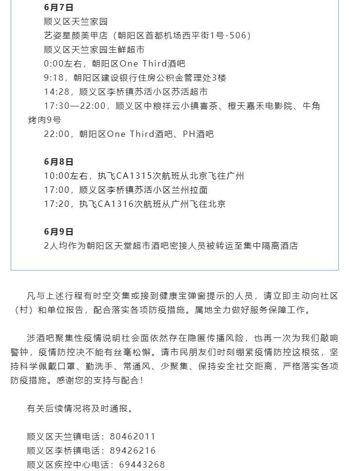 6月10日凌晨,北京順義區在集中隔離管控人員中發現2名核酸檢測陽性人員,系外區涉酒吧聚集性疫情關聯人員,現分別居住在天竺鎮天竺家園、李橋鎮蘇活小區,已轉運至定點醫院。