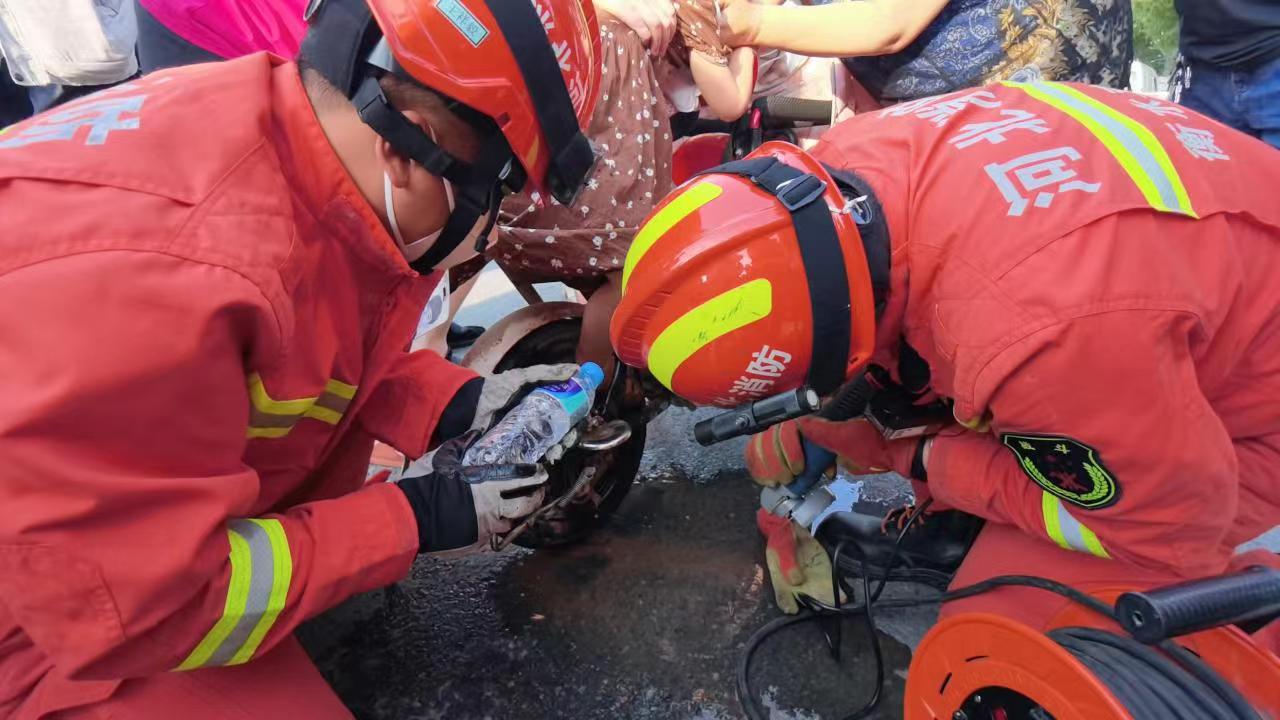 消防救援人員趕到現場后發現,1名4歲小女孩右腳被卡在電動車后輪輪轂內,腳踝處扭曲紅腫。情況緊急,救援人員首先叮囑家長護住小女孩頭部穩定其情緒,隨后利用角磨機對電動車進行破拆。為防止小女孩因角磨機過熱燙傷,指戰員用涼水在一旁不斷對破拆部位進行冷卻,經過5分鐘的緊張救援,小女孩右腳被成功取出并移交現場醫護人員救治。