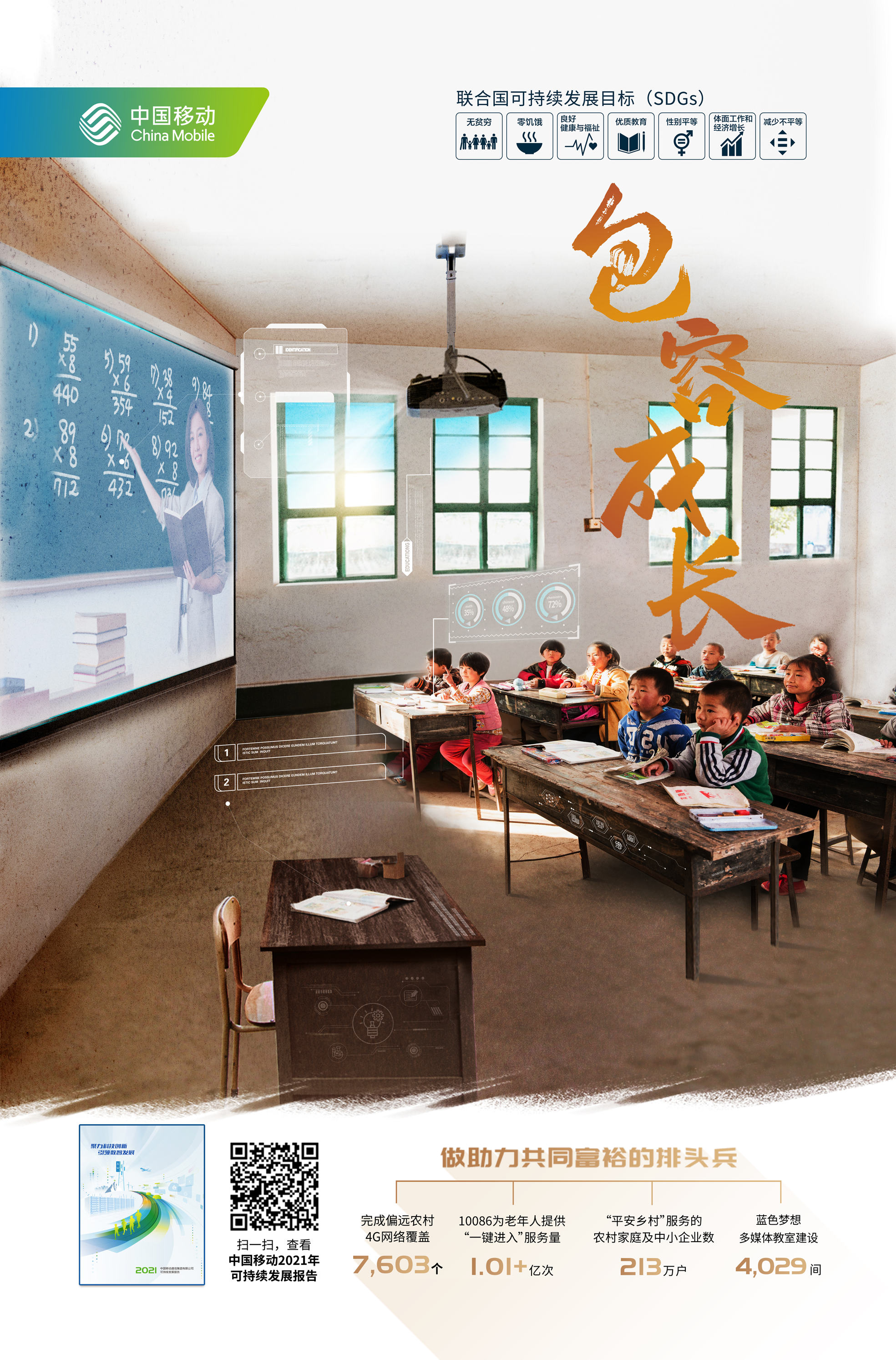 培育全面發展人才,推進實現共同富裕。中國移動推動“人才強企”戰略工程,完善人才培養體系,積極推進“五小”暖心工程和“幸福 1+1”等員工關愛項目。主動服務國家區域發展戰略,部署推動區域協調發展專項工作,積極推動“一帶一路”沿線基礎設施建設,提供高質量國際化信息服務;通過產品和服務創新,幫助老年人、殘障人士、偏遠地區居民等特殊群體跨越數字應用鴻溝,共享信息紅利;深化“網絡+”鄉村振興模式,制定實施《“十四五”數智鄉村振興計劃》,做好“七項幫扶舉措”鞏固拓展脫貧成果,創新實踐“七大鄉村數智化工程”注智賦能鄉村振興;“藍色夢想”項目累計培訓近13萬名中西部農村中小學校長,促進區域教育均衡;愛“心”行動累計為七千余名貧困患兒提供免費先心病手術救治,帶來“心”生希望。