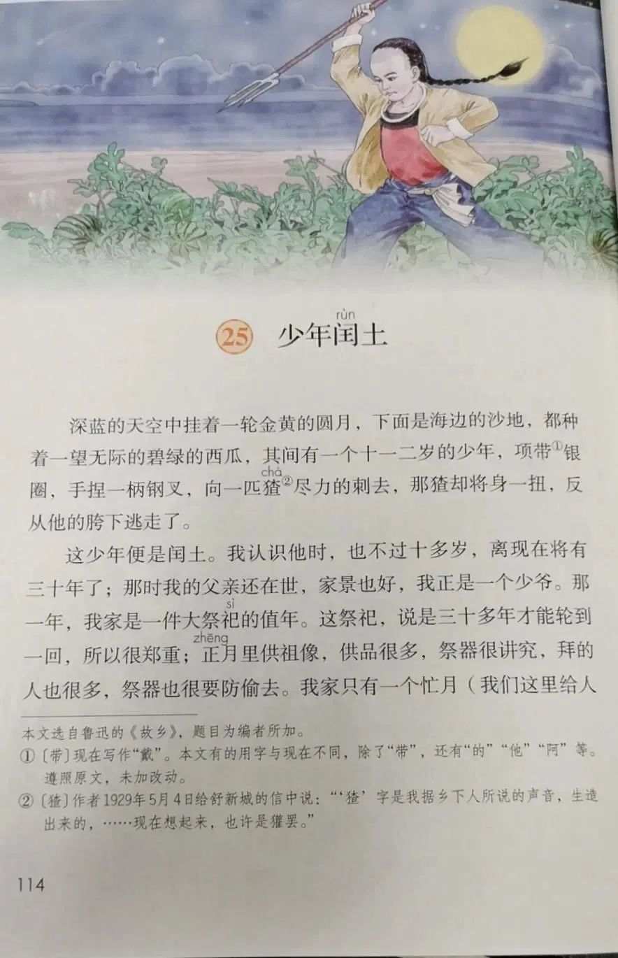 節(jié)選自魯迅小說(shuō)《故鄉(xiāng)》的《少年閏土》,被歷套教材選入,是小學(xué)生最熟悉的魯迅作品。圖/小學(xué)語(yǔ)文六年級(jí)上冊(cè)