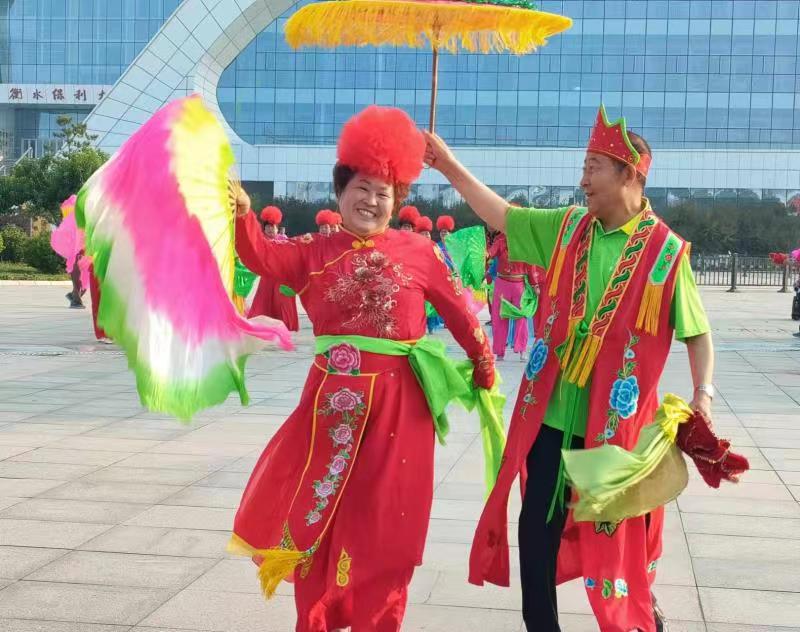 飛揚的裙擺、舞動的綢扇、優美靈動的舞姿……在九州廣場南側,衡水曉麗秧歌隊的隊員們和著富有節奏的音樂,扭起了秧歌。這支秧歌隊中有年輕的舞者,更不乏年長的老人,他們劃旱船、騎毛驢、打花傘、舞扇弄綢、獻藝斗技,豐富的表情、滑稽幽默的表演,引得現場觀看的市民掌聲連連、笑聲不斷。有的市民拿出手機記錄下這一歡樂時刻,還有的市民情不自禁地跟在隊伍后面扭了起來,營造出團結、歡樂、祥和、喜慶的節日氛圍。