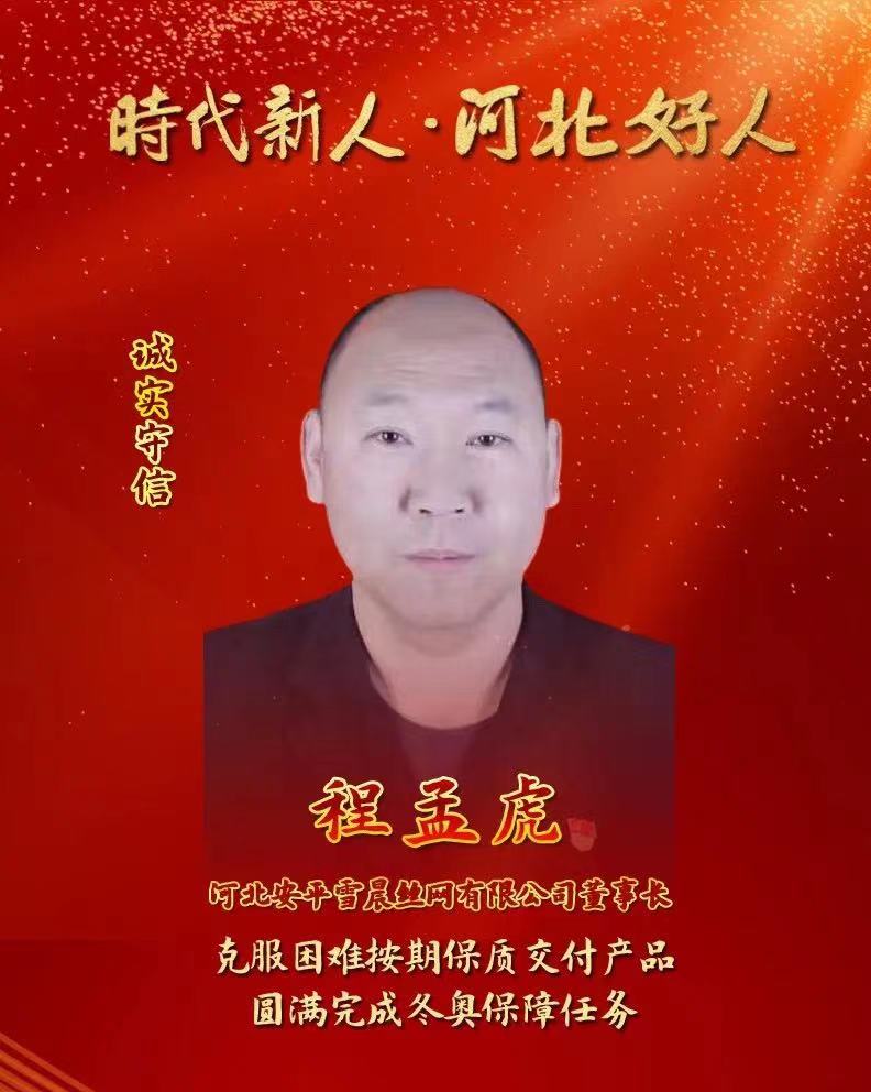 謳歌身邊好人,展示時代風采。近日,經各地各單位推薦、網友點贊評議、評議會綜合審議,河北省文明辦發布了2022年6月“時代新人·河北好人”,克服困難按期保質交付產品,圓滿完成冬奧保障任務的衡水安平雪晨絲網有限公司董事長程孟虎入選。