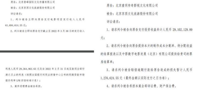 公告顯示,北京文化于近日收到北京登峰國(guó)際文化傳播有限公司《起訴書》、北京壹同傳奇影視文化有限公司《起訴狀》、嘉影上行(北京)文化傳媒有限公司《起訴狀》和西虹市影視文化(天津)有限公司《起訴狀》。