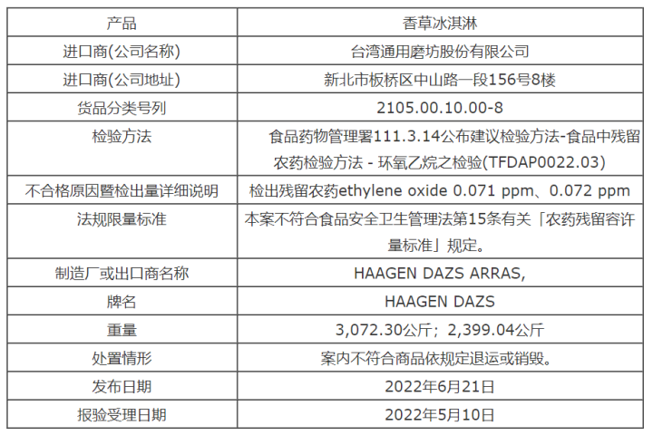 哈根達斯方面稱,此次進口到中國臺灣地區的香草品脫冰淇淋(有效日期為2023年4月13日)以及香草桶裝冰淇淋(有效日期為2022年10月26日),被發現含有極微量殘留農藥環氧乙烷,為保障消費者權益并對食品安全盡到把關責任,第一時間已做緊急處理,同時呼吁今年4月26日以后購買到相關批號的民眾,可持購買證明至原通路退款,退款期限至今年的8月31日。