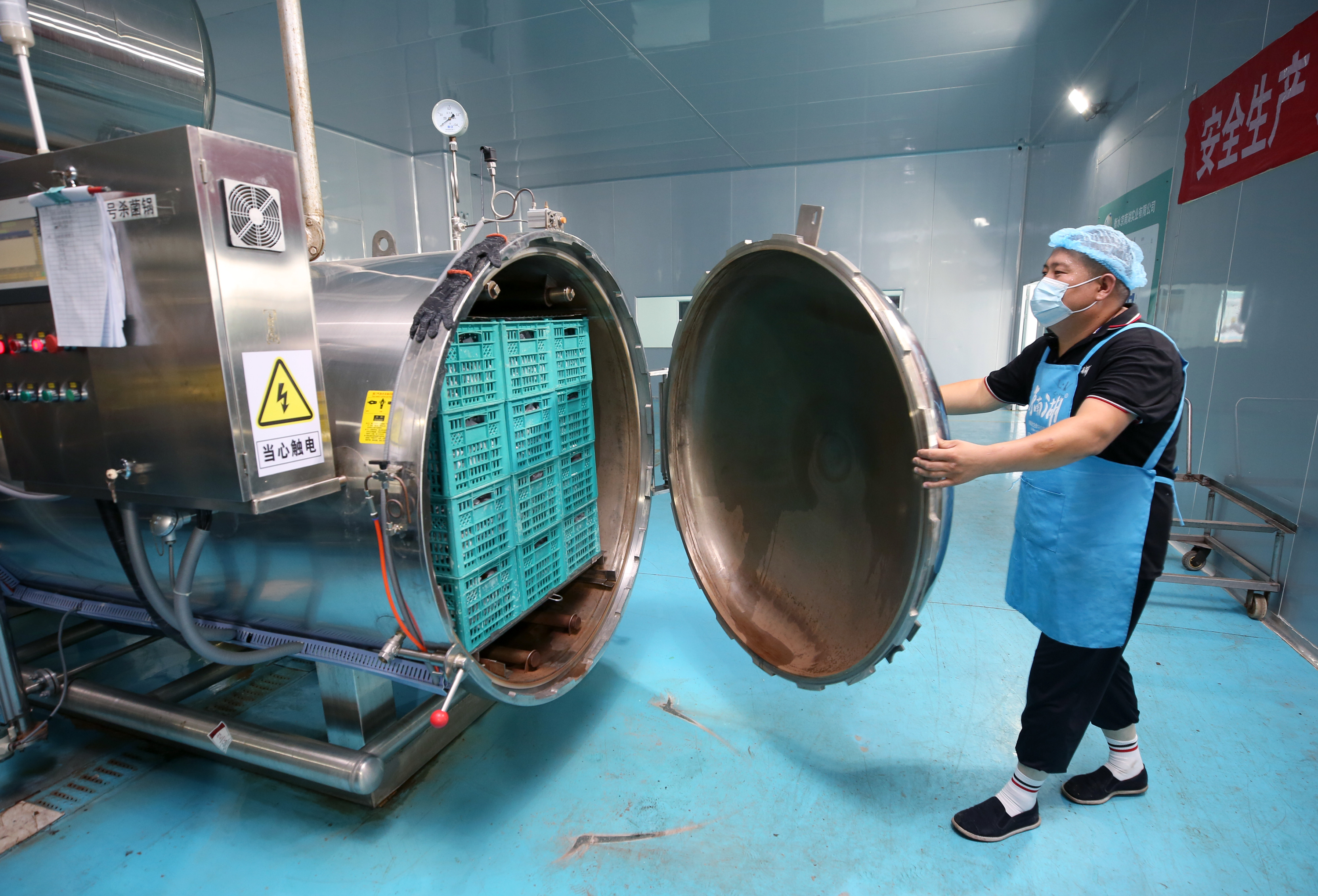 加工車間內(nèi),一臺臺大型現(xiàn)代化自動設(shè)備,一道道先進、繁瑣、考究的生產(chǎn)工藝,令人嘖嘖稱奇。袁站磊介紹,要烤制出焦香油多、健康美味的鴨蛋,需要經(jīng)過腌制、清洗、分選、蒸烤、真空包裝、滅菌等11道工序。“泥腌鴨蛋需要溫度控制在22°C至24°C之間,靜置40天左右;在蒸烤鍋需進行185分鐘特定溫度的蒸烤;為了保質(zhì)期更長,鴨蛋真空包裝后還需121°C高溫持續(xù)殺菌30分鐘……”說起工藝,袁站磊滔滔不絕。而這些工藝的完成,離不開成套的先進設(shè)備——全自動洗蛋機,每小時可清洗3萬枚鴨蛋;裂紋分選檢測機,可通過光檢、聲波測試挑出裂紋蛋,自動稱重后根據(jù)個頭大小放入相應(yīng)軌道;真空包裝機,為鴨蛋進行真空包裝……