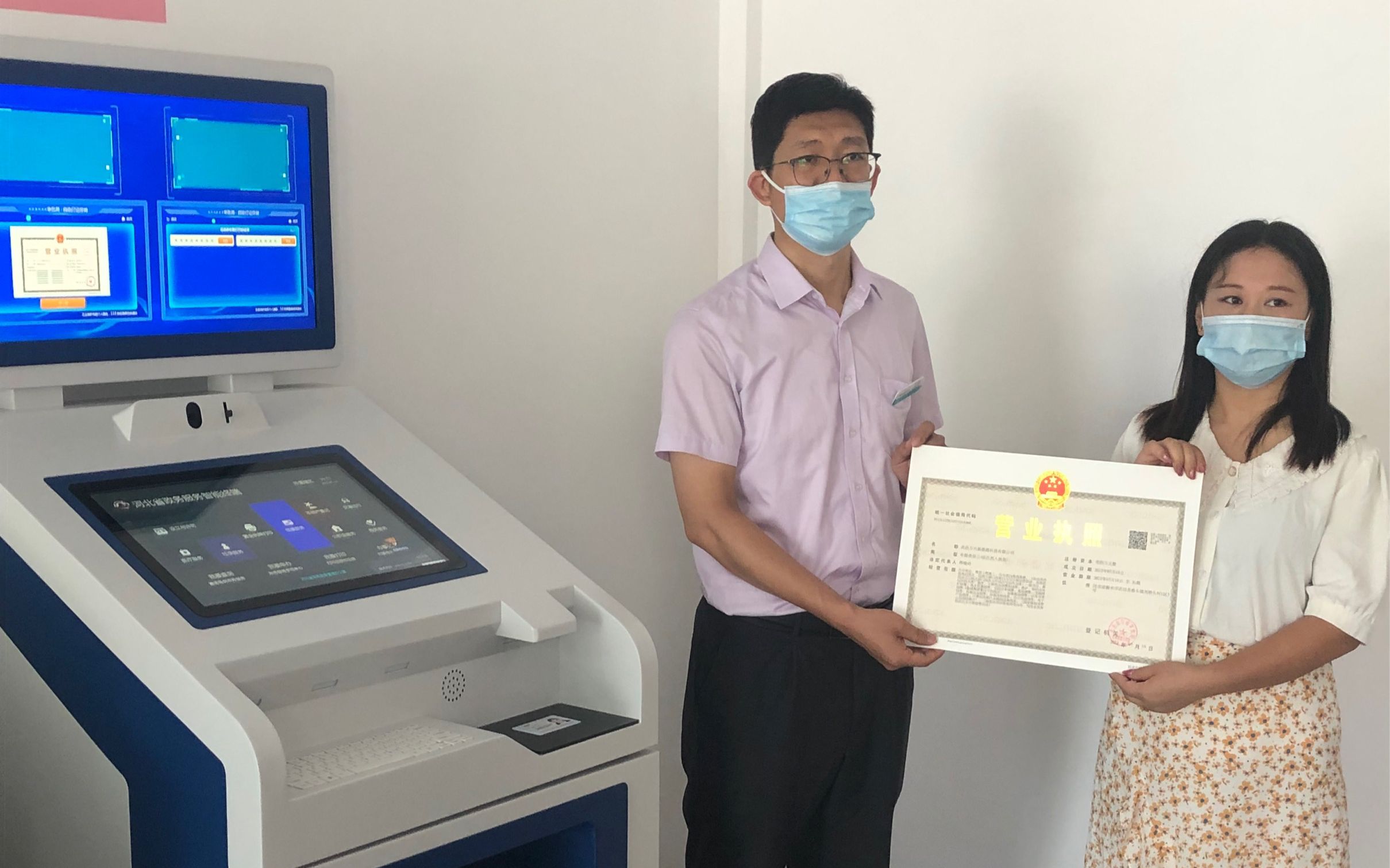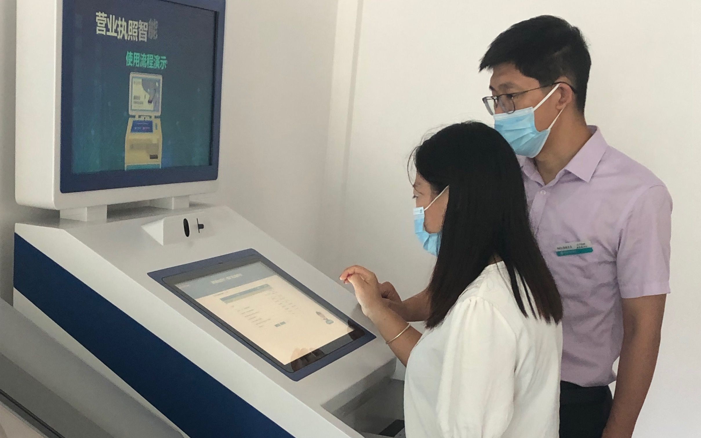 在農業銀行武邑縣支行內,辦事群眾正站在河北政務服務智能終端一體機前打印營業執照,打印完畢后,就近在銀行的業務窗口直接辦理開戶業務,不用再去政務服務大廳打印,省時便捷,實現了讓數據“多跑路”,群眾“少跑腿”。