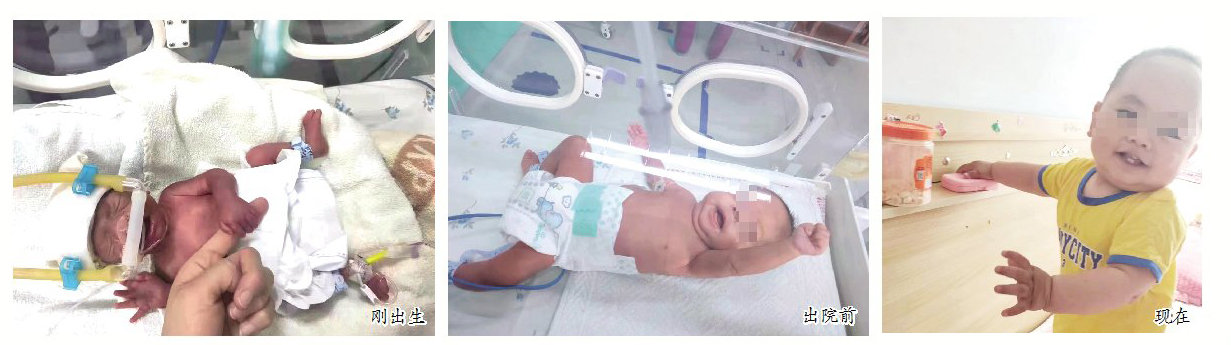 上邊三張照片都是同一個人,他叫童童。一張是體重1075克,剛剛出生時躺在育兒箱中;一張是體重2380克,臨出院前的狀態;另一張是23斤,出生1年零3個月后扶著墻在家快樂地玩耍。