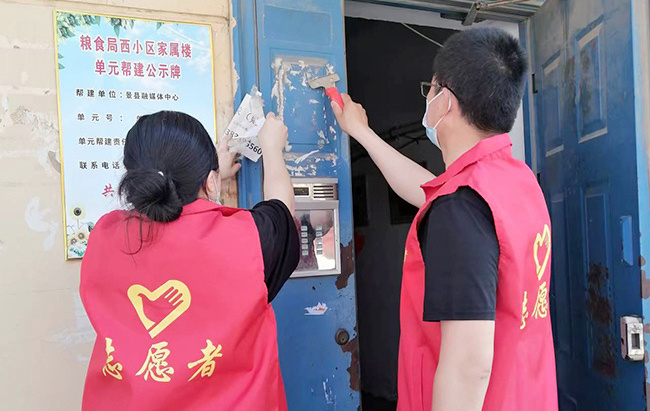 志愿者清除單元門上的小廣告。景縣融媒體中心供圖