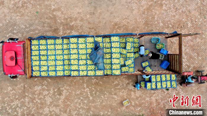 桃子裝車現場。(無人機照片) 苗鳳強 攝