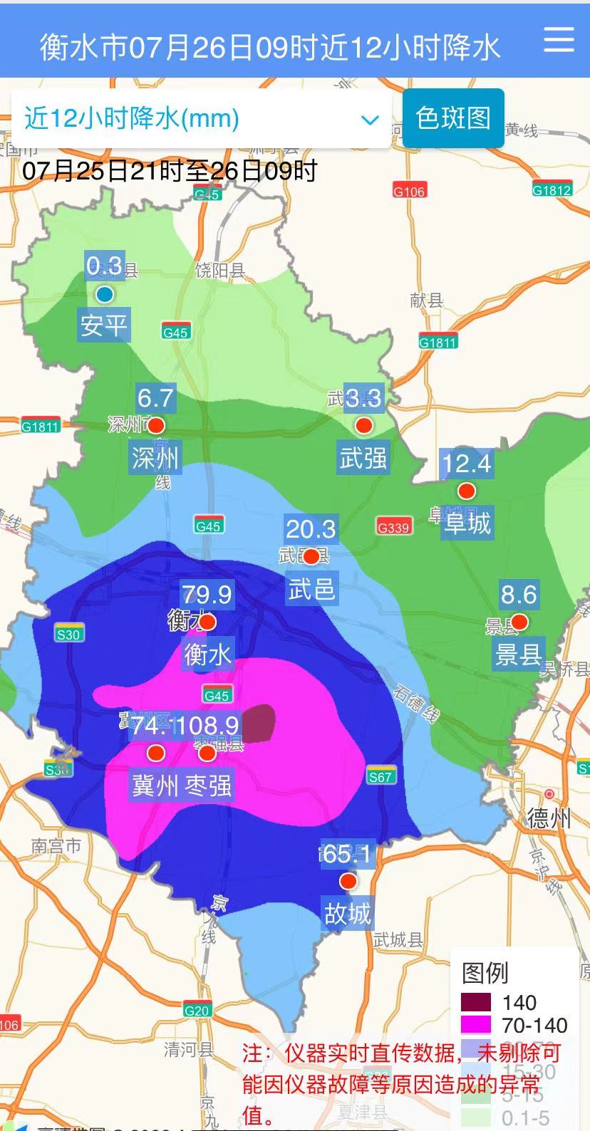 記者從衡水市氣象臺獲悉,25日8時至26日8時,全市平均降水量24.6毫米;最大為棗強(qiáng)馬屯人影站180.9毫米,另有6站100.6~161.2毫米,為大暴雨級別;34個氣象站50.1~94.4毫米,為暴雨級別;44站10~48.7毫米,其它10以下;市區(qū)27.5~94.4毫米,市氣象局站94.4毫米,暴雨級別。