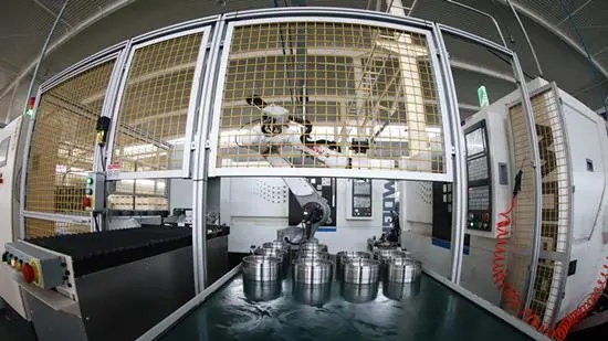 (↑臨西縣現代化軸承智能工廠生產車間,機器人在控制臺操作機器)