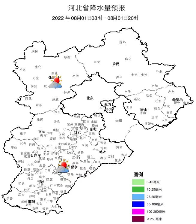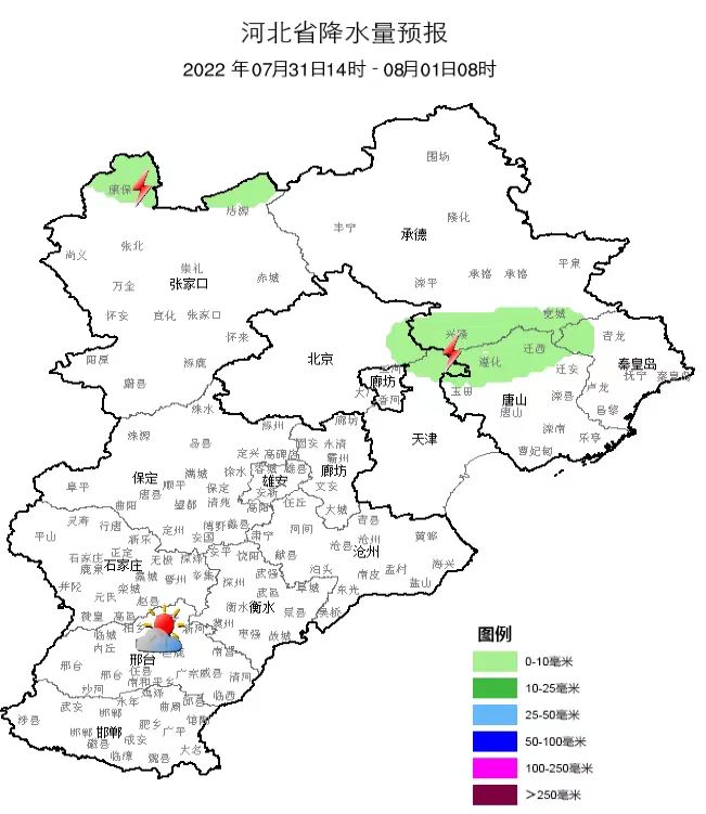 具體天氣預報為:7月31日夜間,多云轉晴,偏東風2~3級,最低氣溫24℃;8月1日,晴轉多云,氣溫34℃~25℃;8月2日,多云,氣溫35℃~28℃;8月3日,多云,氣溫36℃~28℃;8月4日,多云,氣溫37℃~29℃;8月5日,雷陣雨轉陰,氣溫37℃~26℃;8月6日,多云,氣溫35℃~27℃。