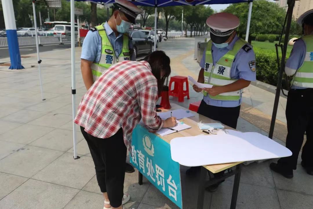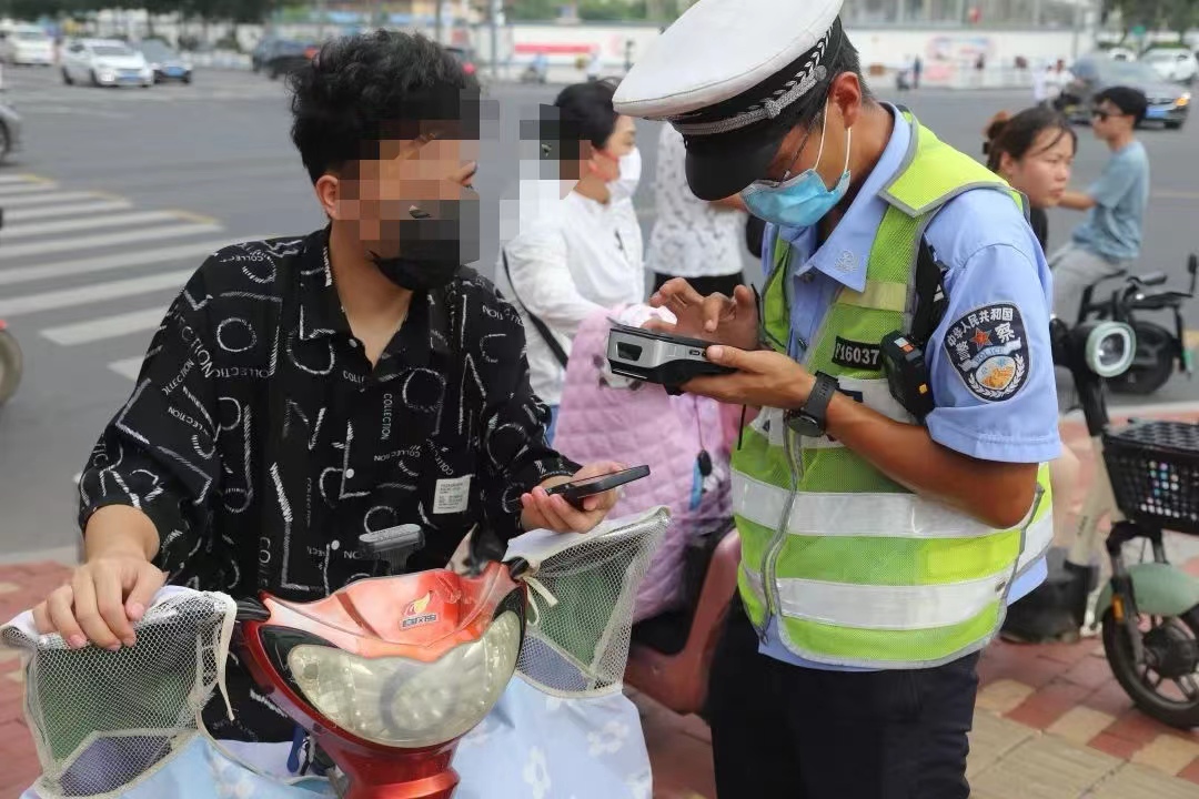 當日上午10時許,記者在勝利路與育才大街交叉口看到,6名執勤交警頭頂烈日,正在開展路面執法整治行動,對不佩戴安全頭盔的電動自行車駕駛人實行掃碼登錄電動車違法處理APP進行登記,對電動自行車未登記上牌及未佩戴安全頭盔的市民嚴格落實“三招不過崗”管理規定,即采取轉發朋友圈積贊、抄寫交通法規、在路口舉提示牌警示他人“三選一”的處罰方式。忙碌中,他們還不忘提醒過往市民遵守交通規則,文明安全出行。
