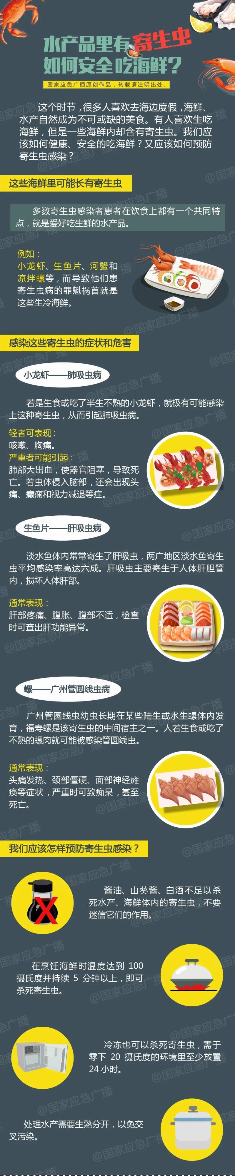 所謂“生腌”,就是把魚、蝦、蟹等海鮮或河鮮,用酒、姜、蒜等調(diào)料腌制,再冷藏或冷凍制作而成。雖然美味,但最近媒體也報道了不少人食用后感染寄生蟲的案例。“生腌”海鮮能吃嗎?白酒、芥末等能殺死食材里的寄生蟲嗎?有什么平時常見的誤區(qū)?一起來看