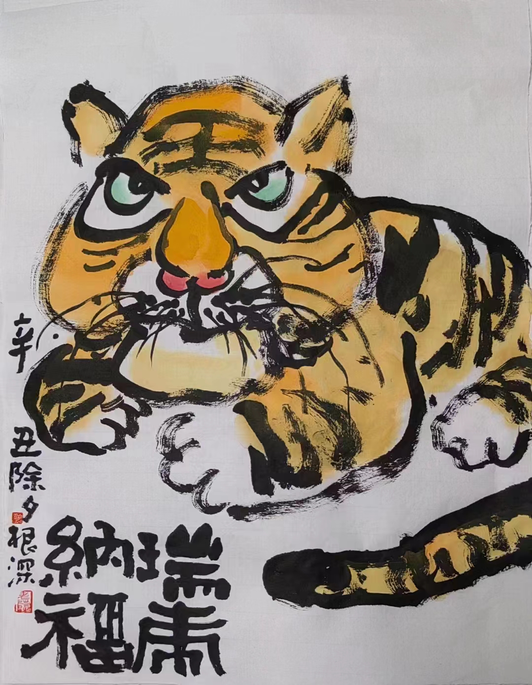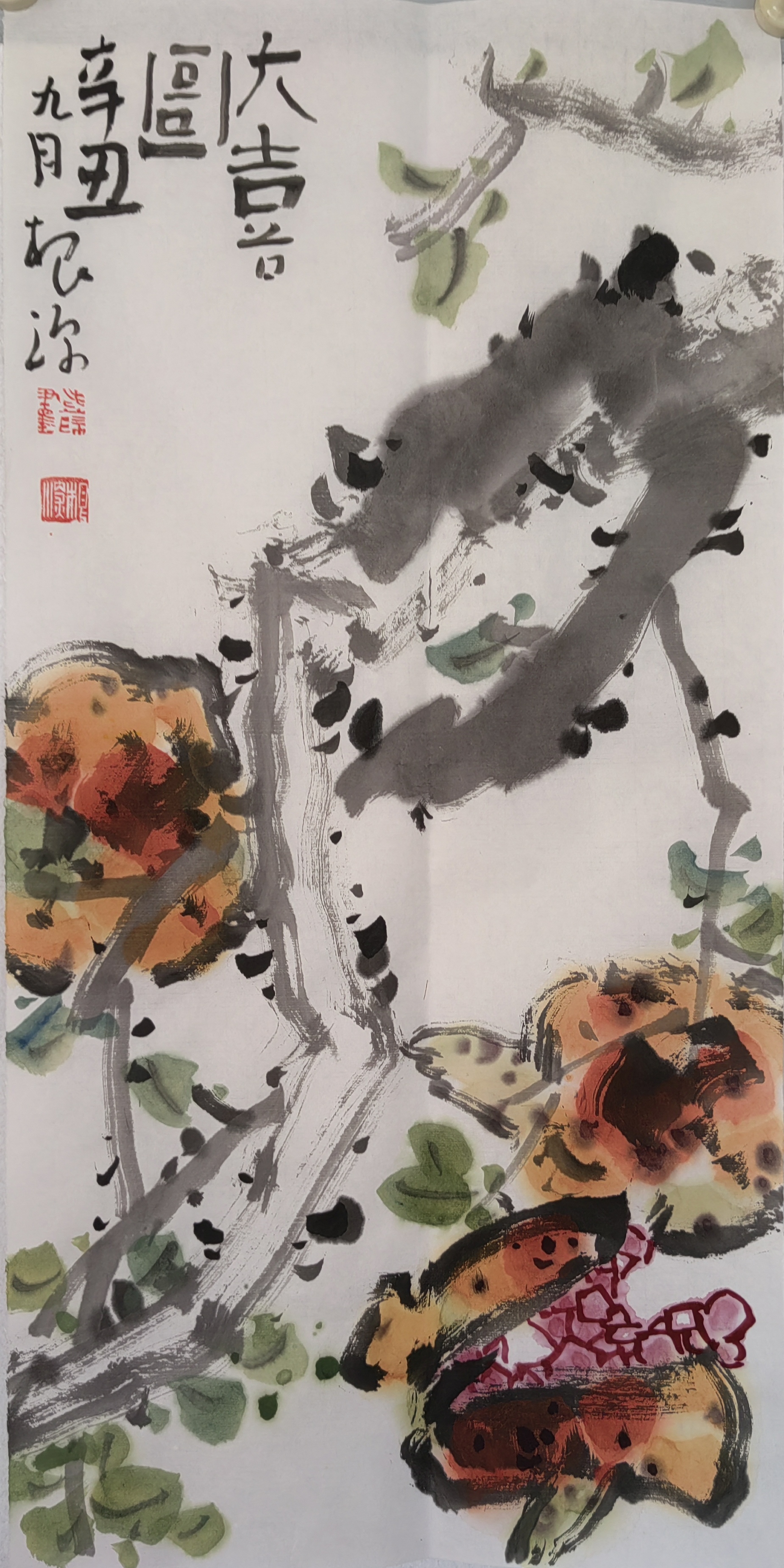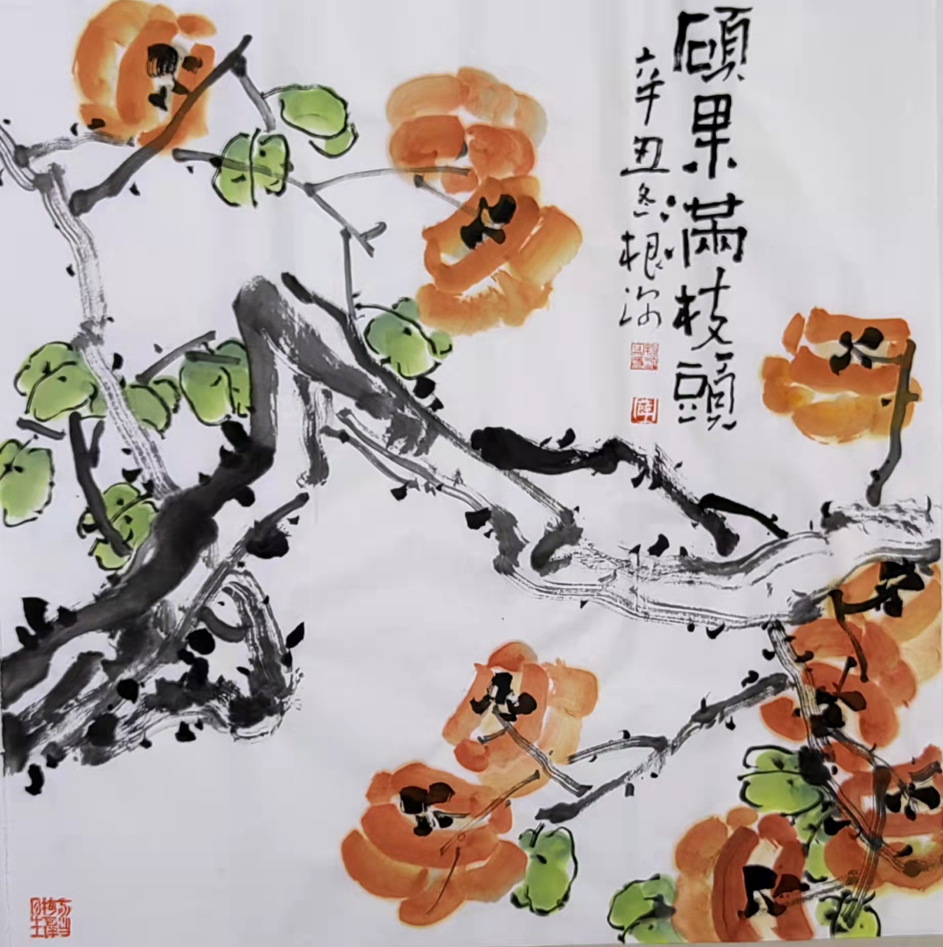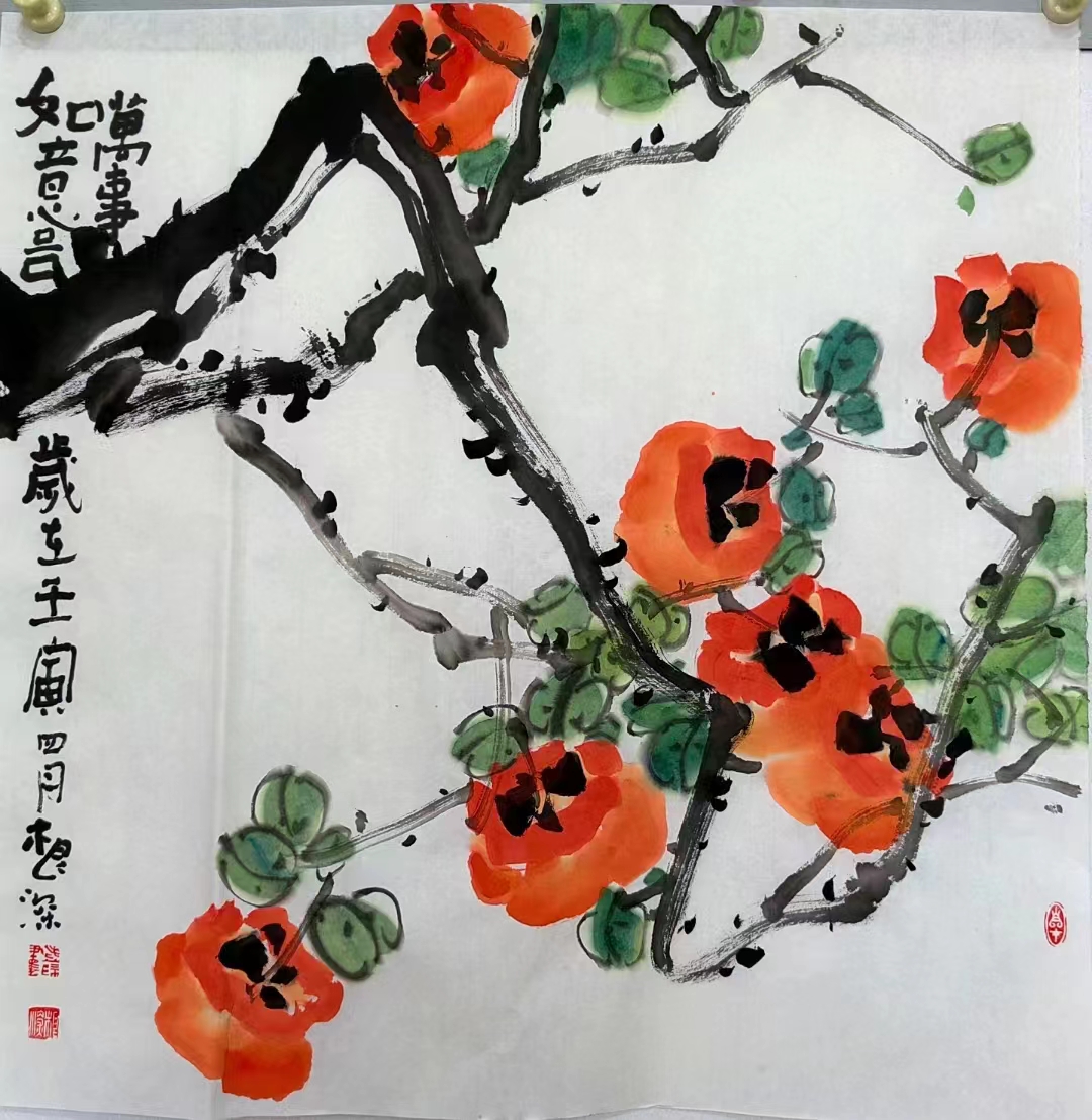 在一次偶然的偶然之間,遇見了薛根深老師的《碩果圖》。那是一幅八平尺大小的畫作,構圖極其簡單,筆道也極盡寫意:幾根老干陳枝上,斜綴著十來個豐腴的柿子,外加一簇墨石和兩竿細竹。